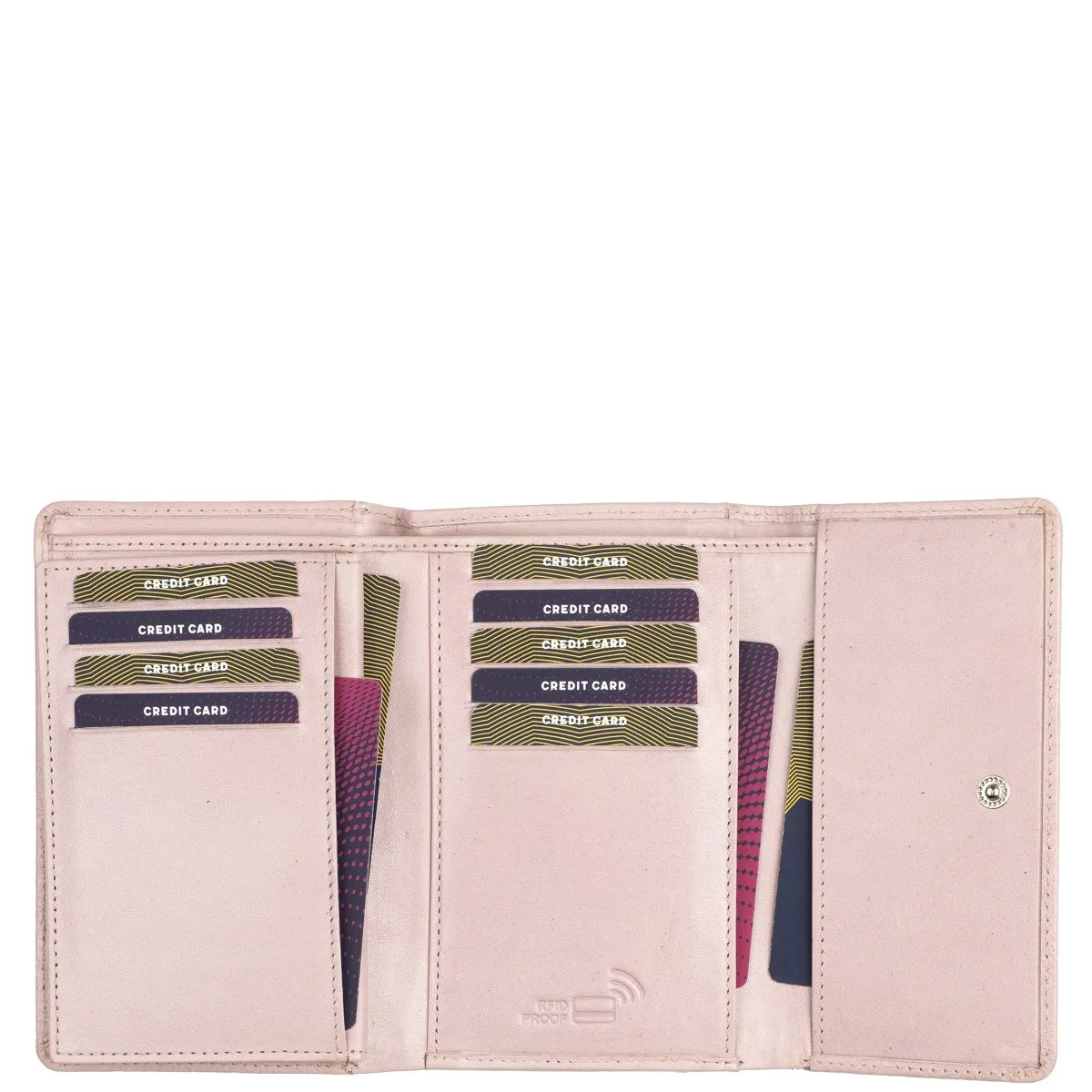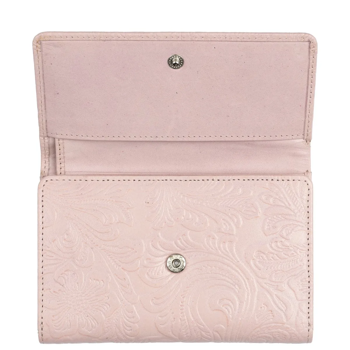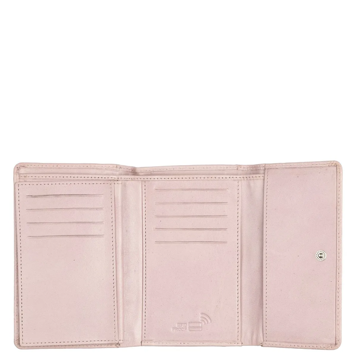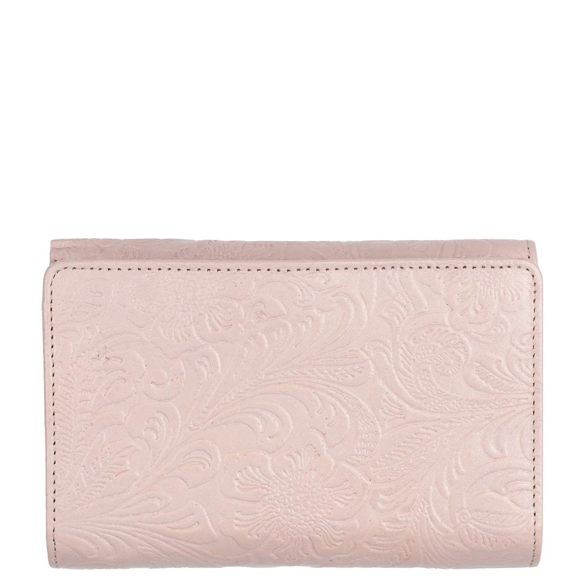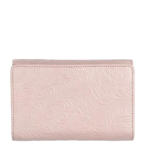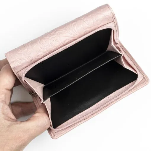 Monipuolinen nahkalompakko upein ruusupainatuksin. Neppariläpän takana jopa 14 korttipaikkaa, iso ikkunallinen korttipaikka esimerkiksi ajokortille sekä useita muita välejä. Taustalla seteliväli ja lompakon takapuolella on vetoketjullinen kaksiosainen tilava kolikkotasku. Mitat: 14 x 9,5 cm