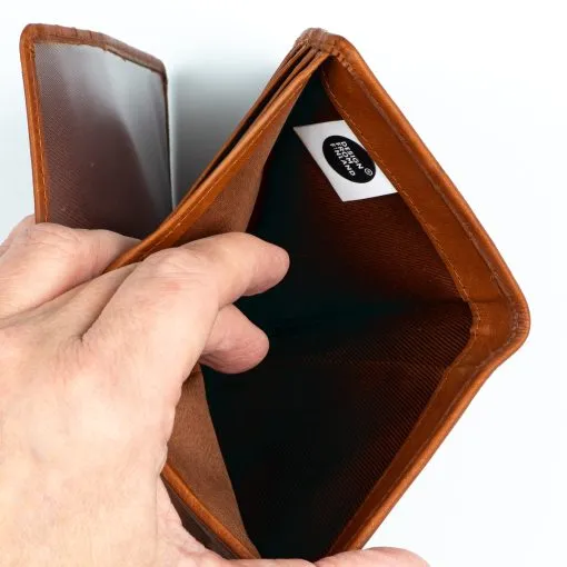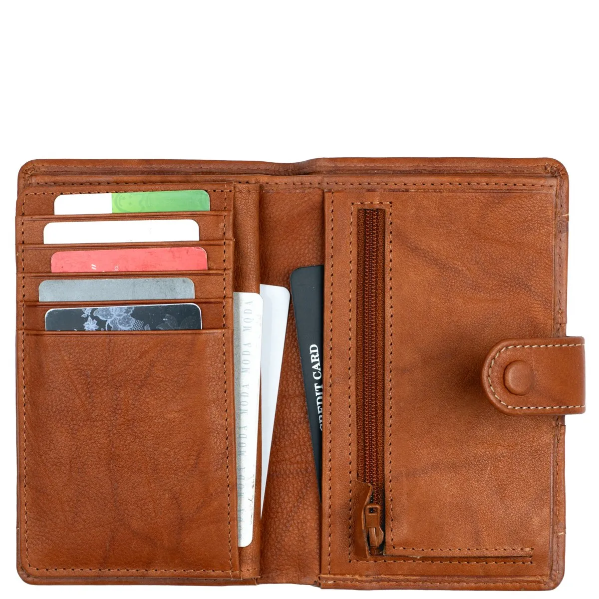 Tyylikäs RFID-suojattu nahkalompakko nepparilla. Sisällä kymmenen tavallista korttipaikkaa, yksi iso ikkunallinen tasku, kaksi pystymallista seteli/paperiväliä ja kolme muuta väliä. Lisäksi taustalla syvä setelivälikkö ja kolikoille vetoketjullinen tasku. Lompakon takapuolella vielä yksi korttipaikka ilman etäluvun estävää RFID-suojausta. Mitat 9 x 14,5 x 2,5 cm.