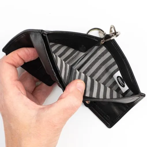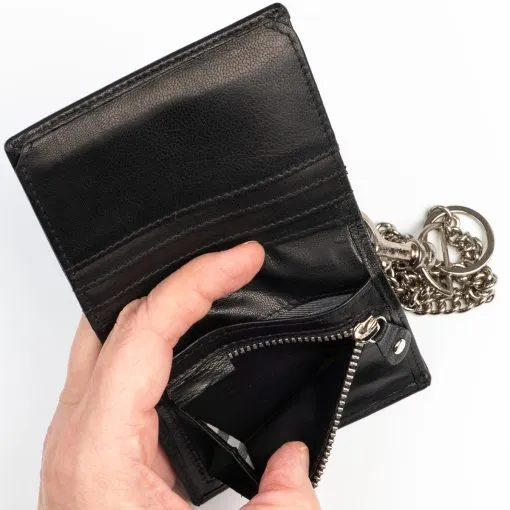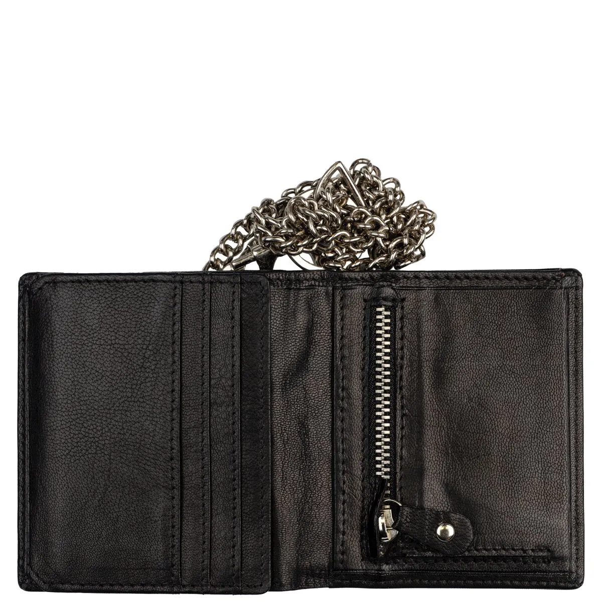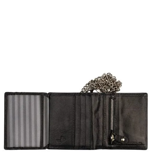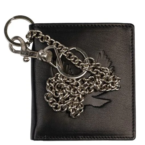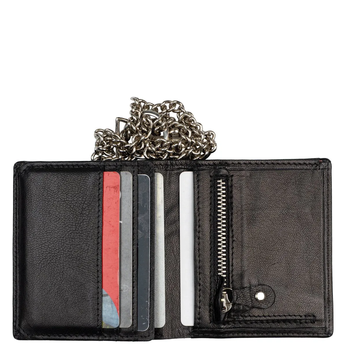 A. Eriksson Eagle-malliston nahkainen lompakko Maa tyylikkäällä painatuksella ja metalliketjulla. Seitsemän keskellepäin aukeavaa korttipaikkaa joista yksi on ikkunallinen. Lisäksi pari muuta väliä, seteleille taustalla tasku jossa vielä piilossa yksi korttipaikka. Kolikoille vetoketjullinen tasku. RFID-suojattu lähimaksukorttien etäluvulta. Mitat 9 x 10 x 1,5 cm.