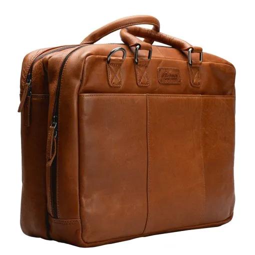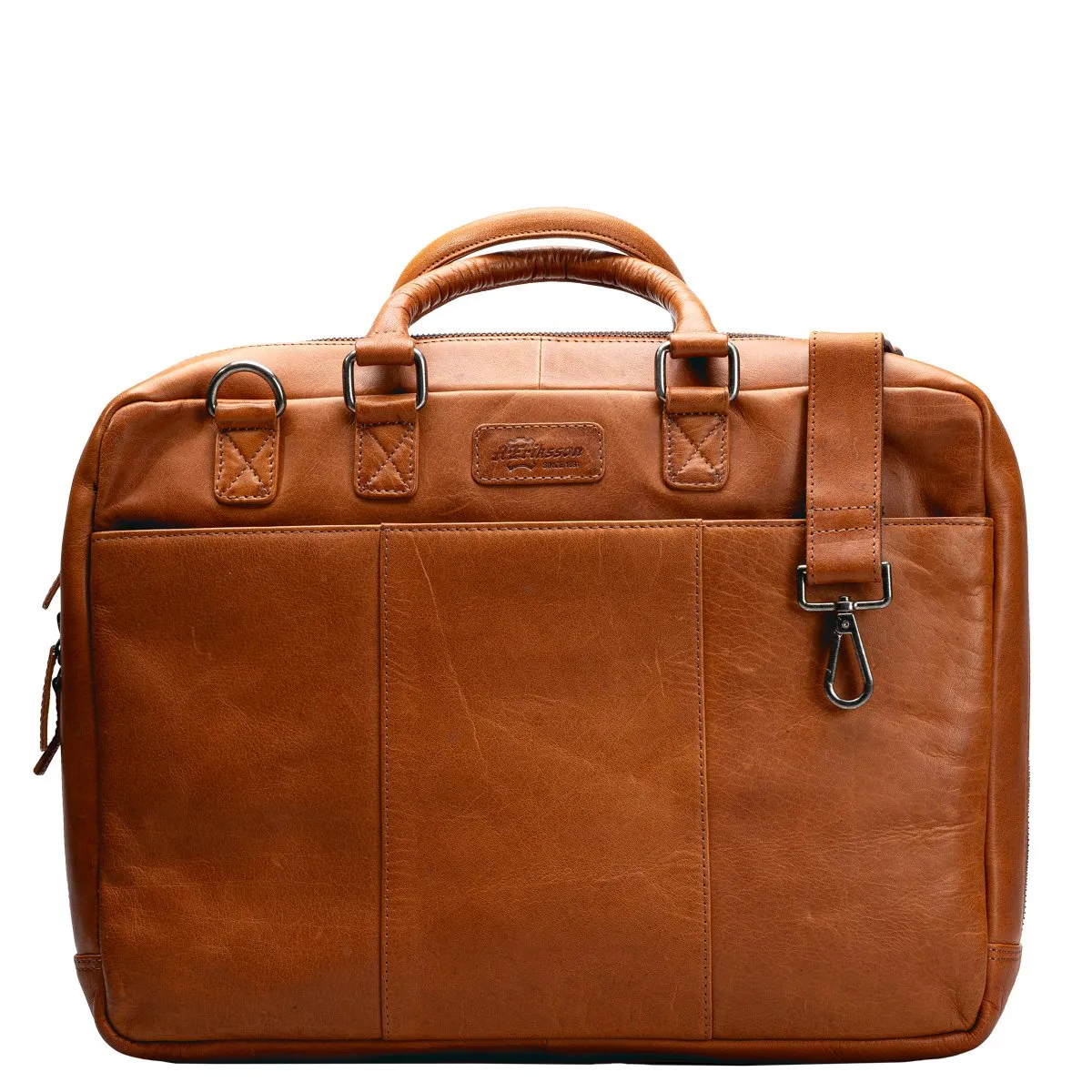 A. Erikssonin Eckerö-malliston Eddie-läppärisalkku monipuolisella sisusratkaisulla. Kaksi tilavaa osiota joista toisessa kaksi leveää avotaskua papereille ym ja kevyesti pehmustettu tarraläpällä suljettava noin 35 x 24 cm tietokoneosasto. Toisessa avarassa osiossa alas asti aukeava vetoketju levikkeillä. Sisällä iso vetoketjutasku, avoin väli ja pieni vetoketjutasku. Lisäksi korttipaikat, kaksi kynäpaikkaa ja puhelintasku. Laukun etupuolella ja takapuolella vielä vetoketjulliset taskut. Takana myös nahkainen remmi josta laukun saa kiinnitettyä matkalaukun aisaan ja matkustamaan kätevästi matkalaukun päälle. Tukevat kantokahvat ja pitkä portaattomasti säädettävä olkahihna liikkuvalla levikepehmikkeellä (noin 75 – 160 cm). Mitat 40 x 30 x 16 cm.