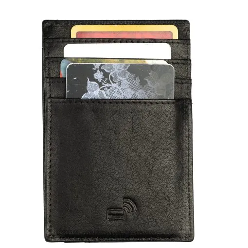A. Eriksson Emmett on tyylikäs RFID-suojattu pieni korttikotelo. Toisella puolella kaksi vaakasuuntaista ja yksi pystysuuntainen korttipaikka, toisella puolella neljä pystysuuntaista korttipaikkaa. Keskellä väli esimerkiksi taitetulle setelille. Mitat 11,7 x 7,5 x 0,5 cm. Mittatiedot