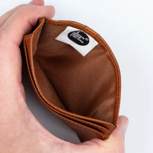 A. Eriksson Emmett on tyylikäs RFID-suojattu pieni korttikotelo. Toisella puolella kaksi vaakasuuntaista ja yksi pystysuuntainen korttipaikka, toisella puolella neljä pystysuuntaista korttipaikkaa. Keskellä väli esimerkiksi taitetulle setelille. Mitat 11,7 x 7,5 x 0,5 cm.