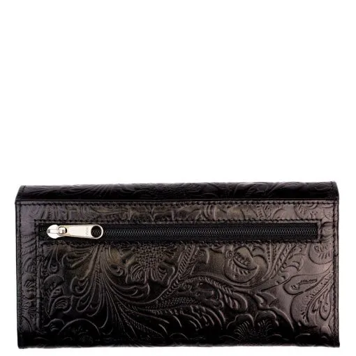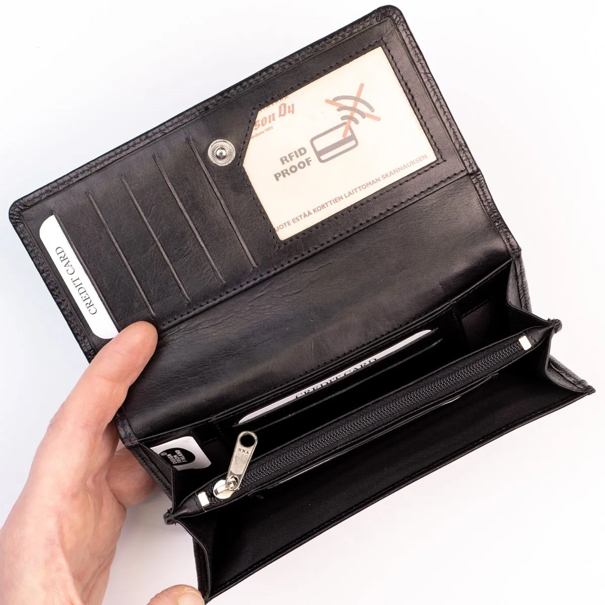Tilava nahkalompakko kahdella isolla lokerolla joiden välissä vetoketjullinen tasku. Tuotteen takana erillinen vetoketjutasku kolikoille. Nepparillisen läpän alla tilaa seteleille, kuiteille ym. 12 korttitaskua joista yksi on läpinäkyvä. Tuotteessa on RFID suojaus mikä estää luvattoman lähimaksun ja kortin sirulla olevien tietojen varastamisen.