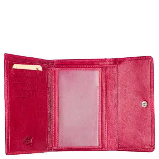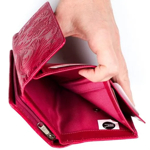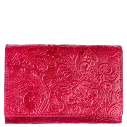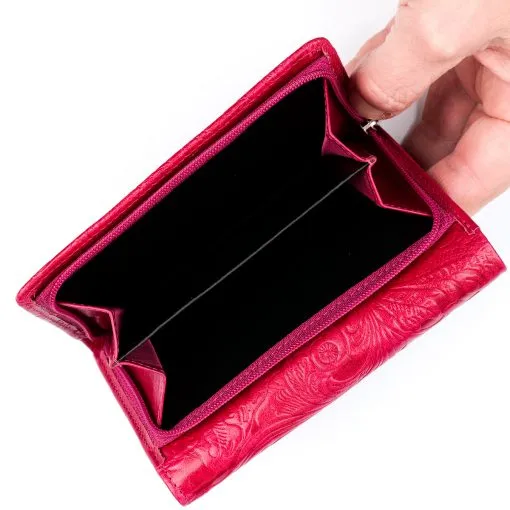 Monipuolinen nahkalompakko upein ruusupainatuksin. Neppariläpän takana jopa 14 korttipaikkaa, iso ikkunallinen korttipaikka esimerkiksi ajokortille sekä useita muita välejä. Taustalla seteliväli ja lompakon takapuolella on vetoketjullinen kaksiosainen tilava kolikkotasku. Mitat: 14 x 9,5 cm