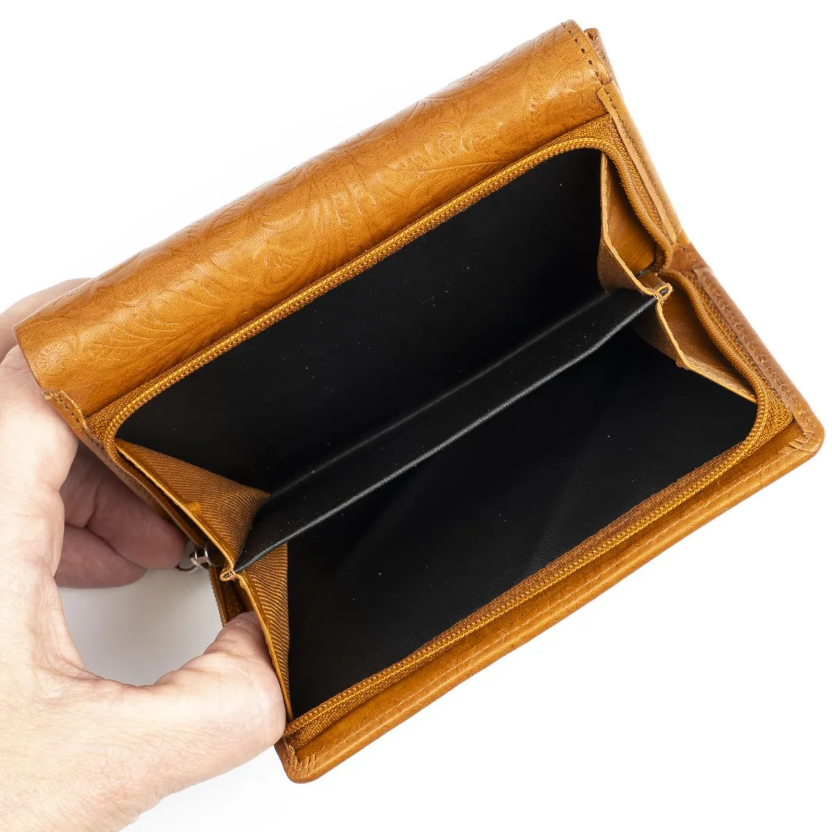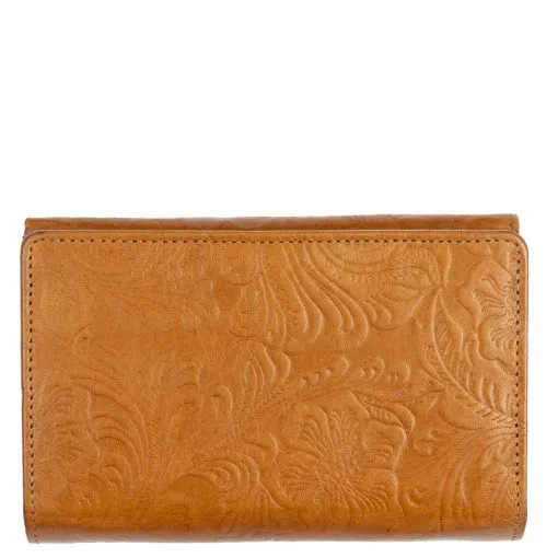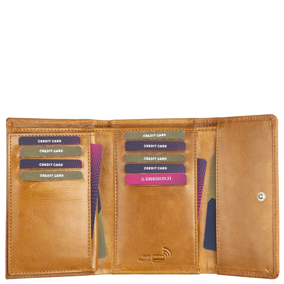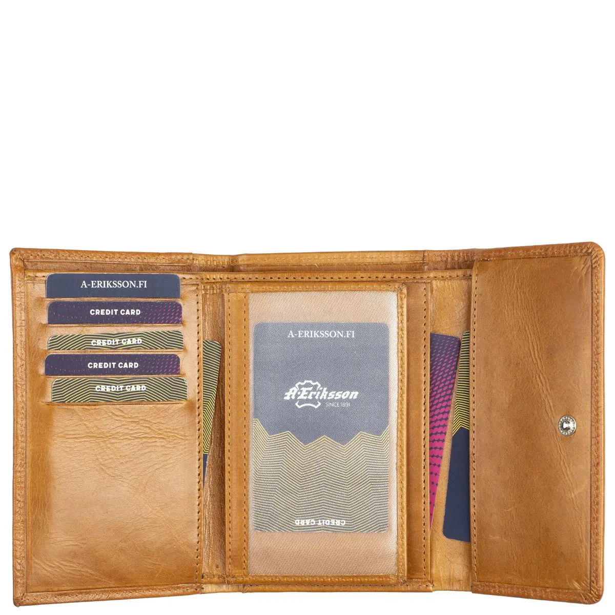 Monipuolinen nahkalompakko upein ruusupainatuksin. Neppariläpän takana jopa 14 korttipaikkaa, iso ikkunallinen korttipaikka esimerkiksi ajokortille sekä useita muita välejä. Taustalla seteliväli ja lompakon takapuolella on vetoketjullinen kaksiosainen tilava kolikkotasku. Mitat: 14 x 9,5 cm