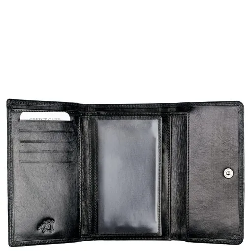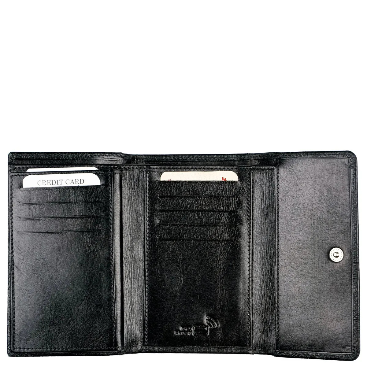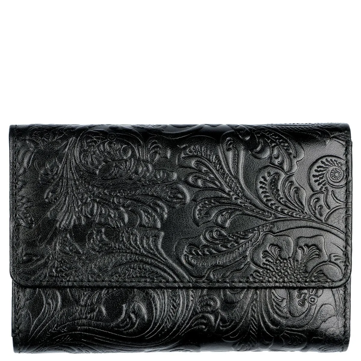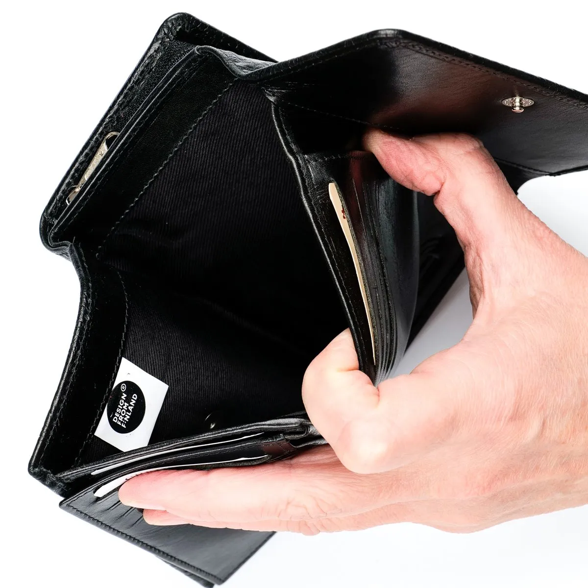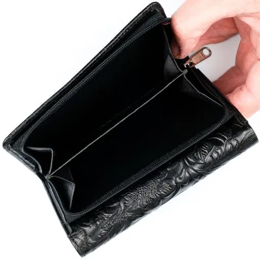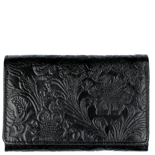 Monipuolinen nahkalompakko upein ruusupainatuksin. Neppariläpän takana jopa 14 korttipaikkaa, iso ikkunallinen korttipaikka esimerkiksi ajokortille sekä useita muita välejä. Taustalla seteliväli ja lompakon takapuolella on vetoketjullinen kaksiosainen tilava kolikkotasku. Mitat: 14 x 9,5 cm