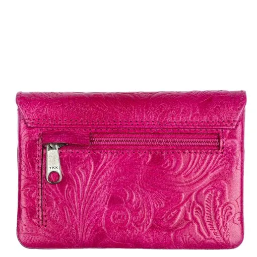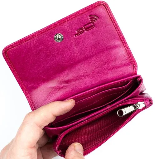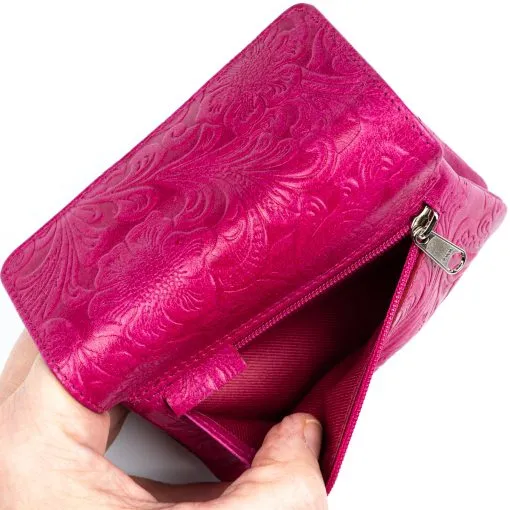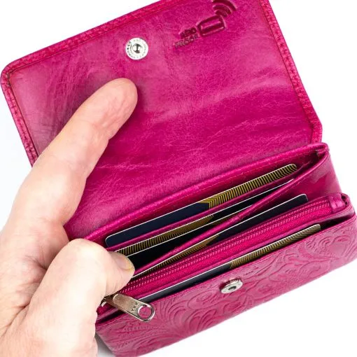 Näppärä nahkainen kukkaro yhdistettynä korttikoteloon kauniilla kuviopainatuksella. Neppariläpän alla on yksi vetoketjullinen tasku sekä kaksi avointa taskua. Toisessa taskuista on yksilölliset korttipaikat kolmelle kortille, mutta kortteja mahtuu useampi avoimeen tilaan. Pussukan takapuolella on vielä vetoketjullinen pikkutasku. Tämä tuote on RFID-suojattu ja estää lähimaksukorttien luvattoman etäluvun.