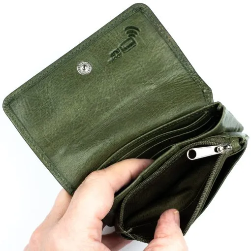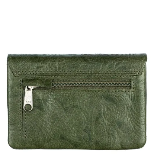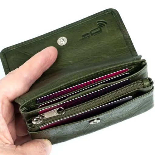 Näppärä nahkainen kukkaro yhdistettynä korttikoteloon kauniilla kuviopainatuksella. Neppariläpän alla on yksi vetoketjullinen tasku sekä kaksi avointa taskua. Toisessa taskuista on yksilölliset korttipaikat kolmelle kortille, mutta kortteja mahtuu useampi avoimeen tilaan. Pussukan takapuolella on vielä vetoketjullinen pikkutasku. Tämä tuote on RFID-suojattu ja estää lähimaksukorttien luvattoman etäluvun.