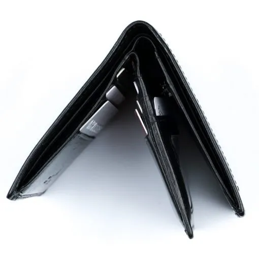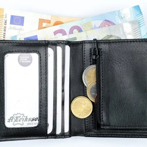 Tyylikäsi nahkalompakko kymmenellä korttipaikalla sekä vetoketjullisella kolikkotaskulla. Yksi korttipaikoista on ikkunallinen. Lompakon taustalla on kaksiosainen seteliväli. Lompakossa on RFID-suojaus, joka estää sirullisen etäluettavien korttien etäluvun. Mitat 9 cm x 10 cm.