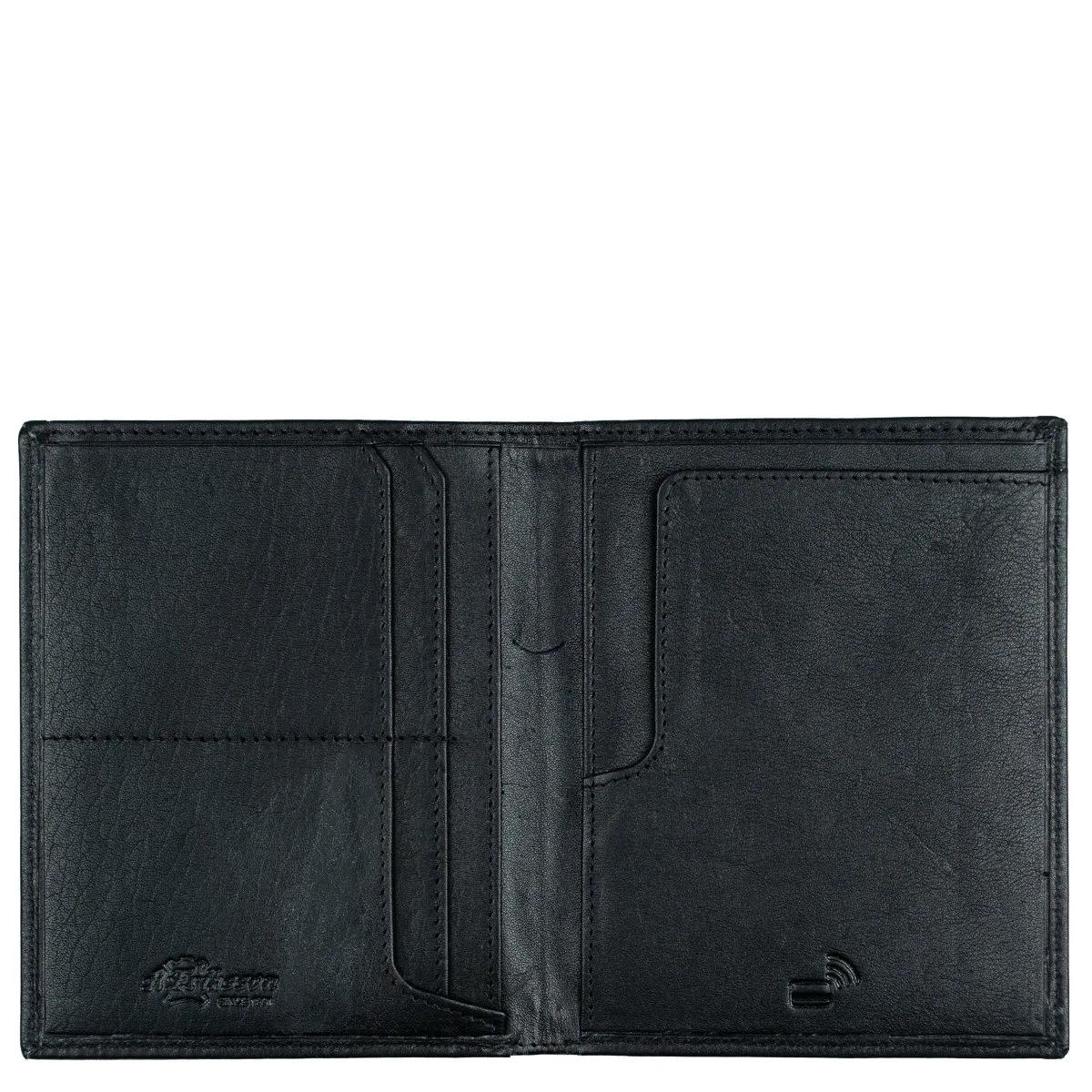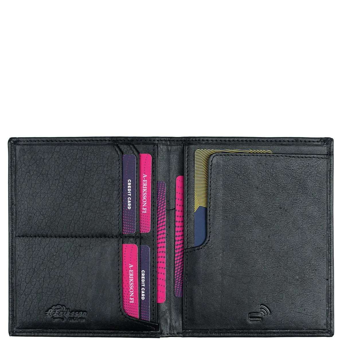 Nahkainen passisuoja neljällä korttipaikalla ja setelivälillä johon myös liput mahtuvat. RFID-suojaus estää sirullisen passin ja lähimaksukorttien luvattoman etäluvun.Mitat: 12 x 14 cm