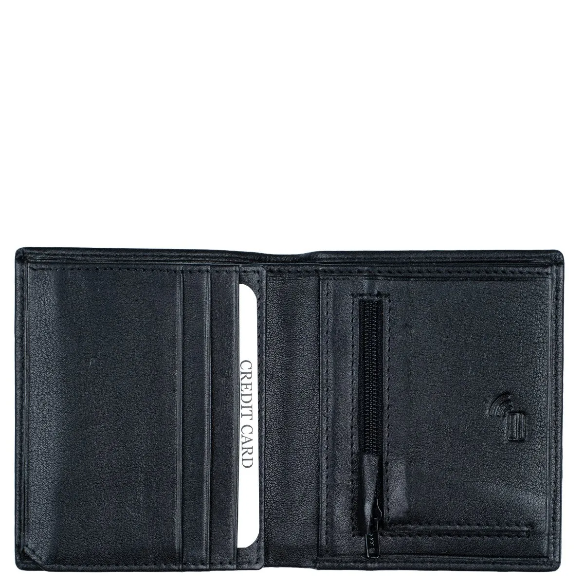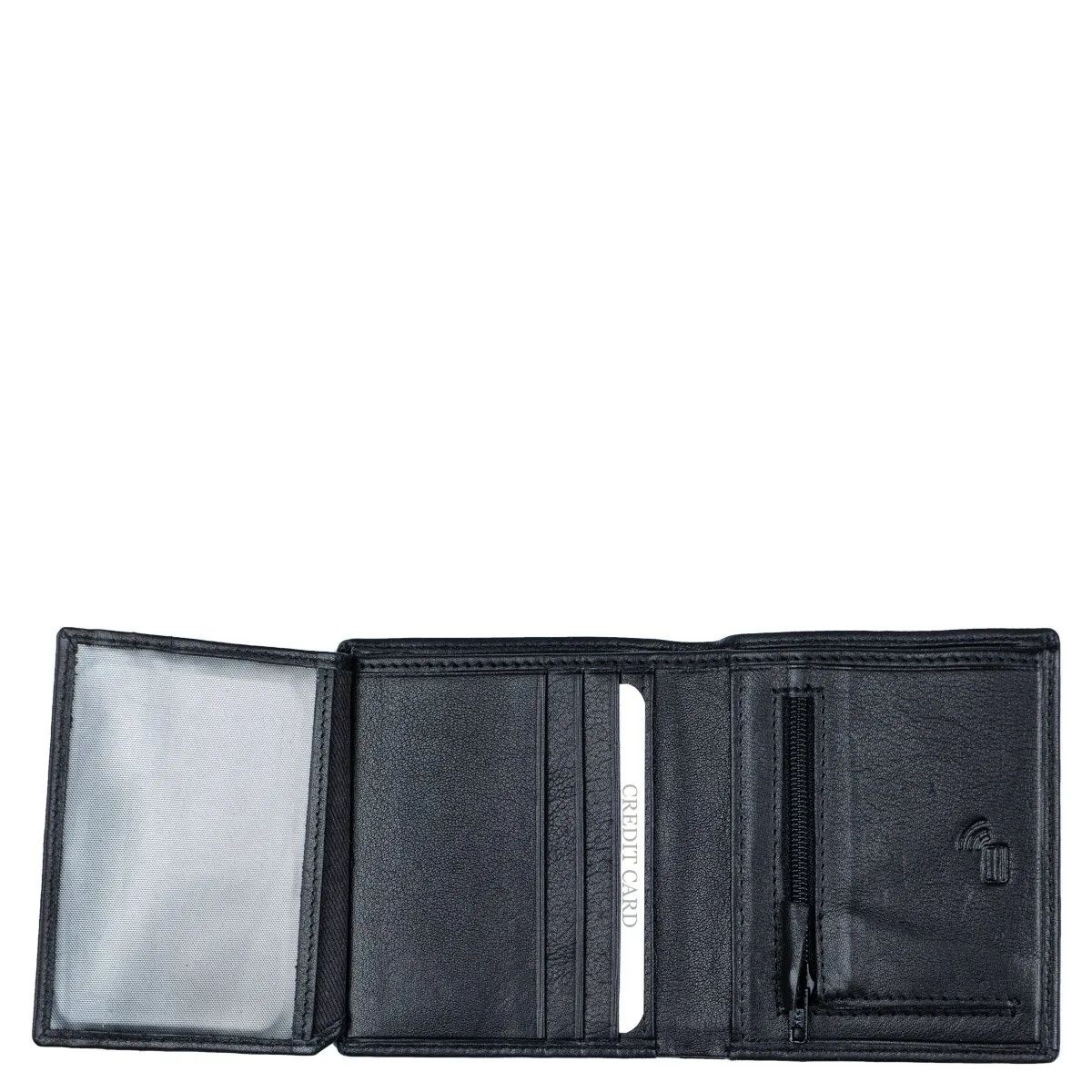 Taskukokoinen nahkalompakko seitsemällä korttipaikalla joista yksi on ikkunallinen. Taustalla seteliväli. Vetoketjullinen kolikkotasku. Lompakko on RFID-suojattu ja kiinniollessaan estää lähimaksukorttien etäluvun.