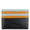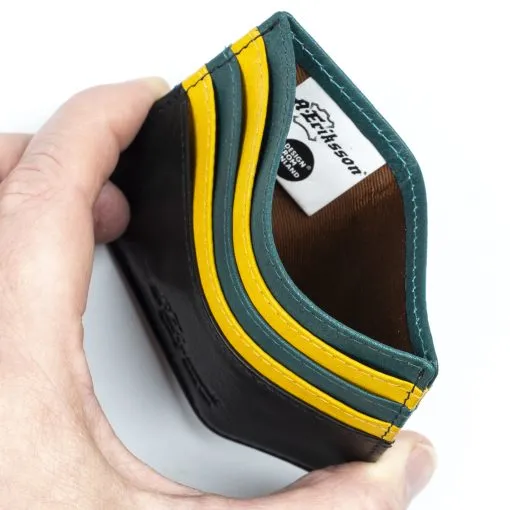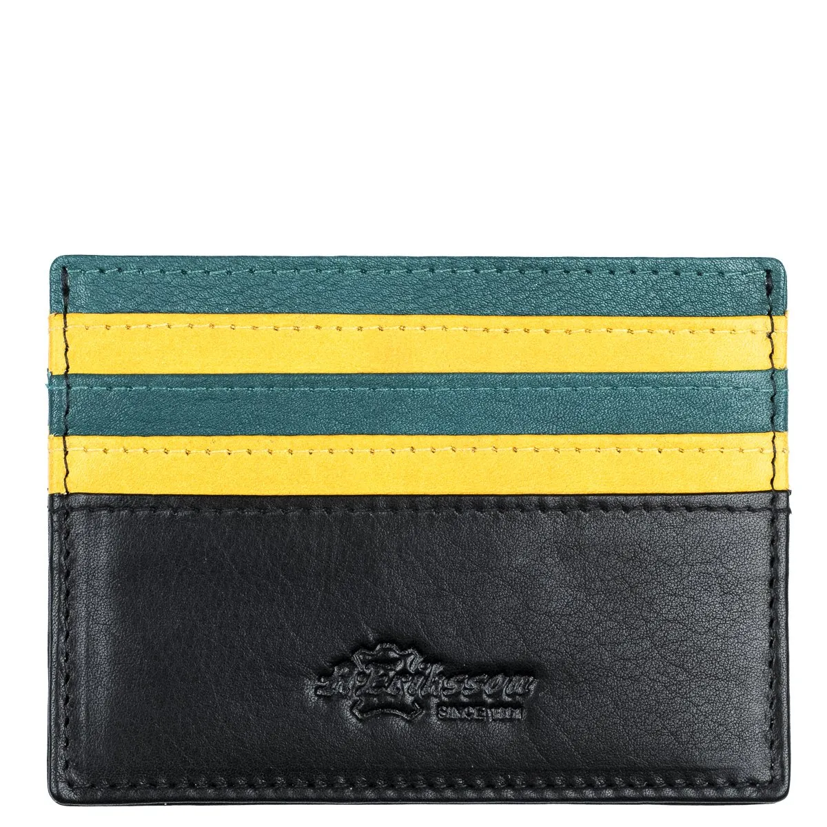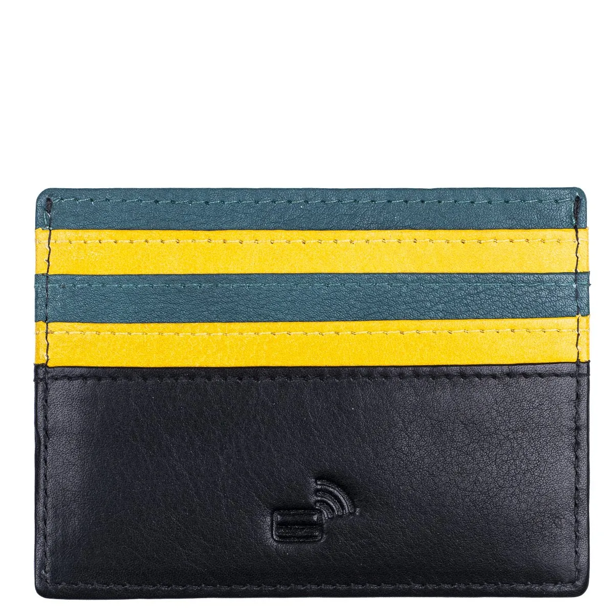 RFID-suojattu nahkainen korttikotelo estää maksukorttien luvattoman etäluvun ja suojaa naarmuilta.
