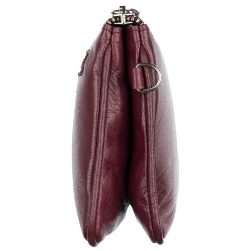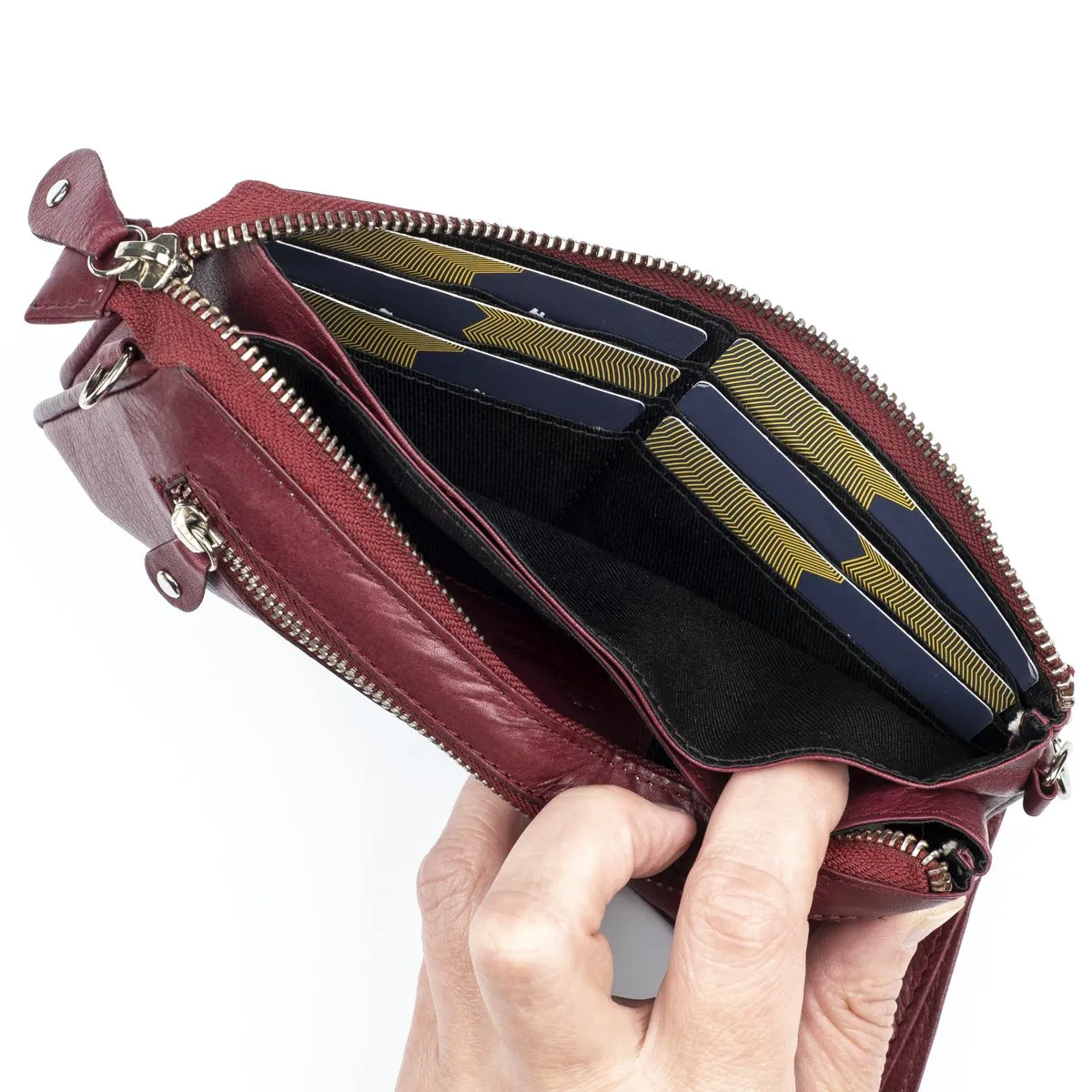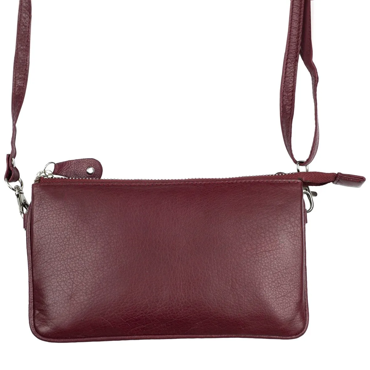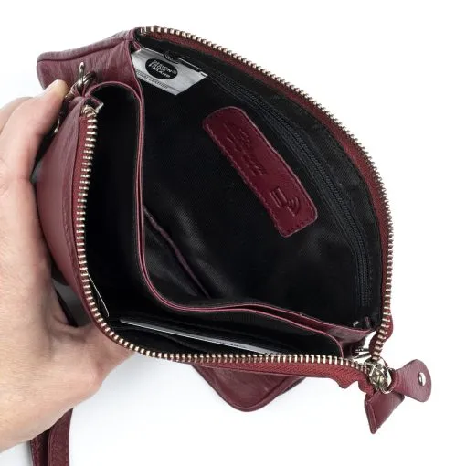 Nahkainen monikäyttöinen pikkulaukku joka sopii niin juhlaan kuin arkeen. Vetoketjullisessa päätaskussa sisällä kolme lokeroa, joista yhdessä kuusi korttipaikkaa ja yhdessä pieni vetoketjutasku. Keskimmäisessä kapeammassa lokerossa voi säilyttää esimerkiksi puhelinta. Takapuolella vielä vetoketjullinen tasku. Mukana sekä pitkä, säädettävä olkahihna että rannehihna. Laukku sopii hyvin myös tilavaksi lompakoksi. Laukussa on RFID-suojaus, joka estää sirullisen etäluettavien korttien ja sirullisen passin etäluvun. Mitat:20 x 12 x 4 cm. Paino 190 g.