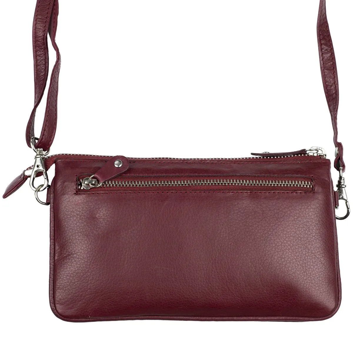 Nahkainen monikäyttöinen pikkulaukku joka sopii niin juhlaan kuin arkeen. Vetoketjullisessa päätaskussa sisällä kolme lokeroa, joista yhdessä kuusi korttipaikkaa ja yhdessä pieni vetoketjutasku. Keskimmäisessä kapeammassa lokerossa voi säilyttää esimerkiksi puhelinta. Takapuolella vielä vetoketjullinen tasku. Mukana sekä pitkä, säädettävä olkahihna että rannehihna. Laukku sopii hyvin myös tilavaksi lompakoksi. Laukussa on RFID-suojaus, joka estää sirullisen etäluettavien korttien ja sirullisen passin etäluvun.