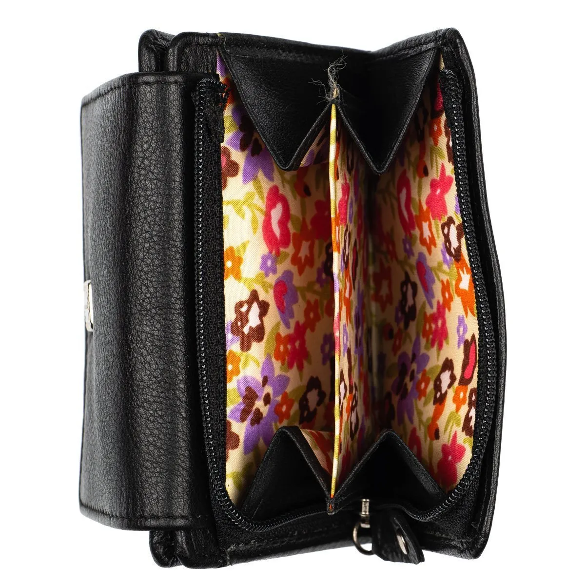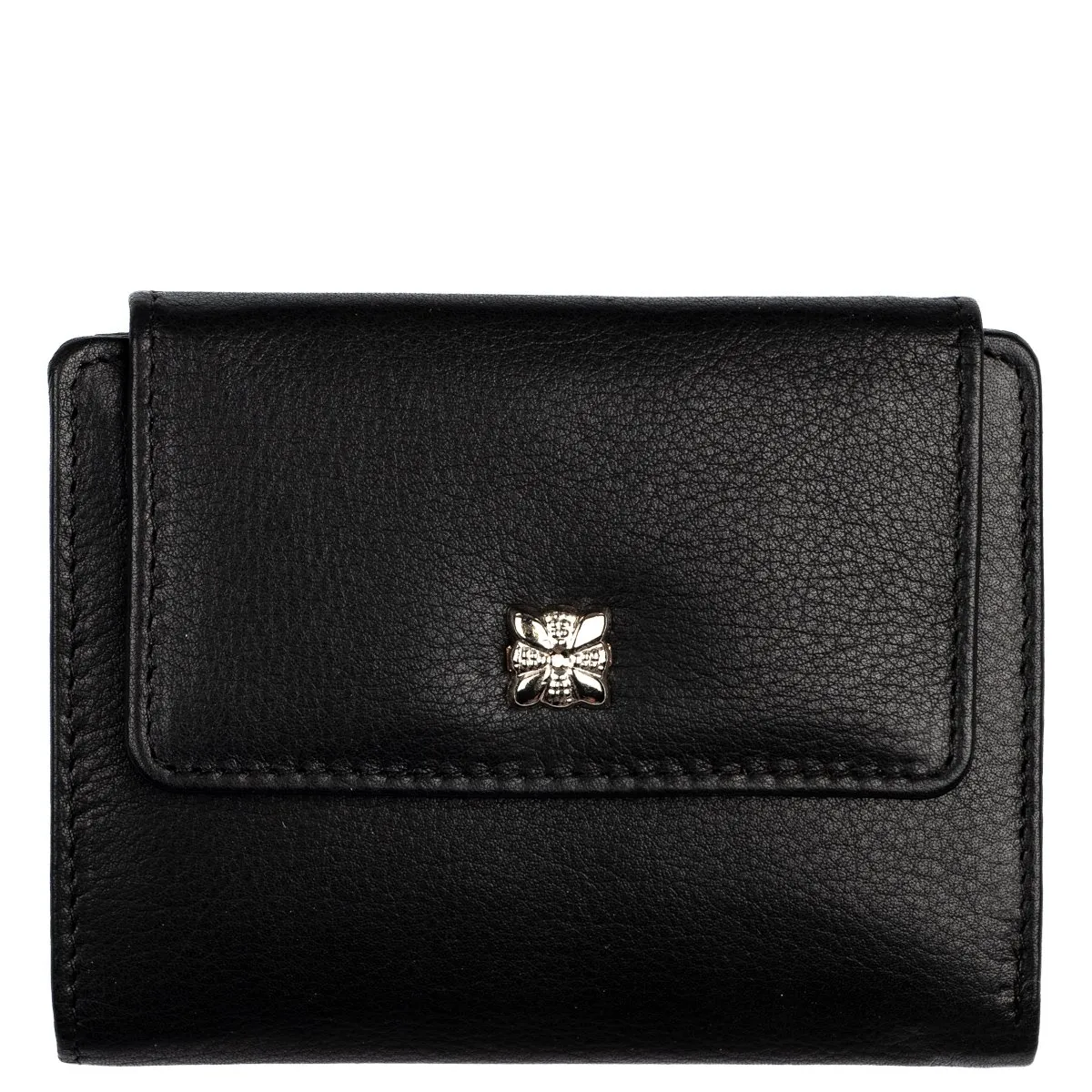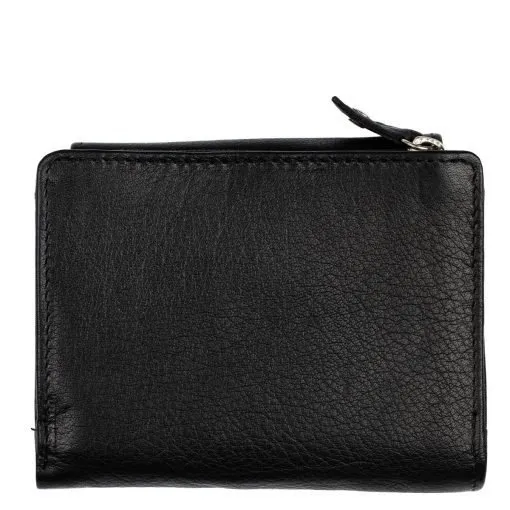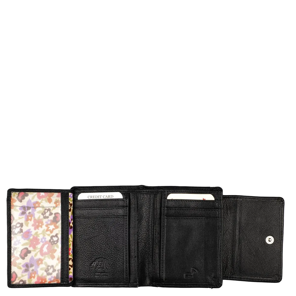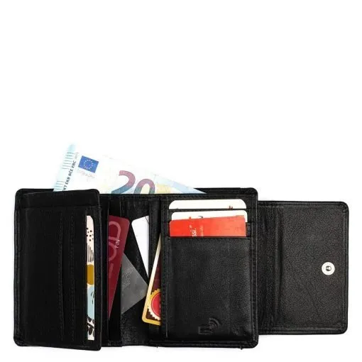 Näppärä ja tyylikäs nahkalompakko monipuolisilla taskuilla. Nepparikiinnitteisen läpän alla on kuusi ylöspäin aukeavaa korttipaikkaa, kolme keskelle aukeavaa korttipaikkaa sekä iso ikkunallinen korttipaikka. Lisäksi viisi muuta taskua. Taustalla seteliväli. Lompakon takapuolella on kaksiosainen vetoketjullinen kolikkopuoli. Tässä lompakossa on RFID-suojaus, joka estää sirullisen etäluettavien korttien etäluvun.