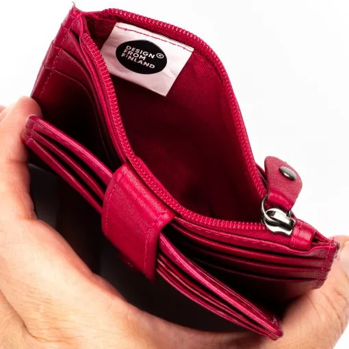 Henriikka-korttikotelo on oikea tilaihme, usean kortin nahkakotelo. Kotelon edessä nepparilla suojattuna neljä korttipaikkaa näkyvillä ja niiden takana 3+3 korttipaikkaa lisää. Tuotteen keskellä pieni vetoketjutasku ja taustalla vielä toiset neljä korttilokeroa. Kotelo on RFID-suojattu ja estää korttien luvattoman etäluvun. Mitat 11 x 9 x 1 cm