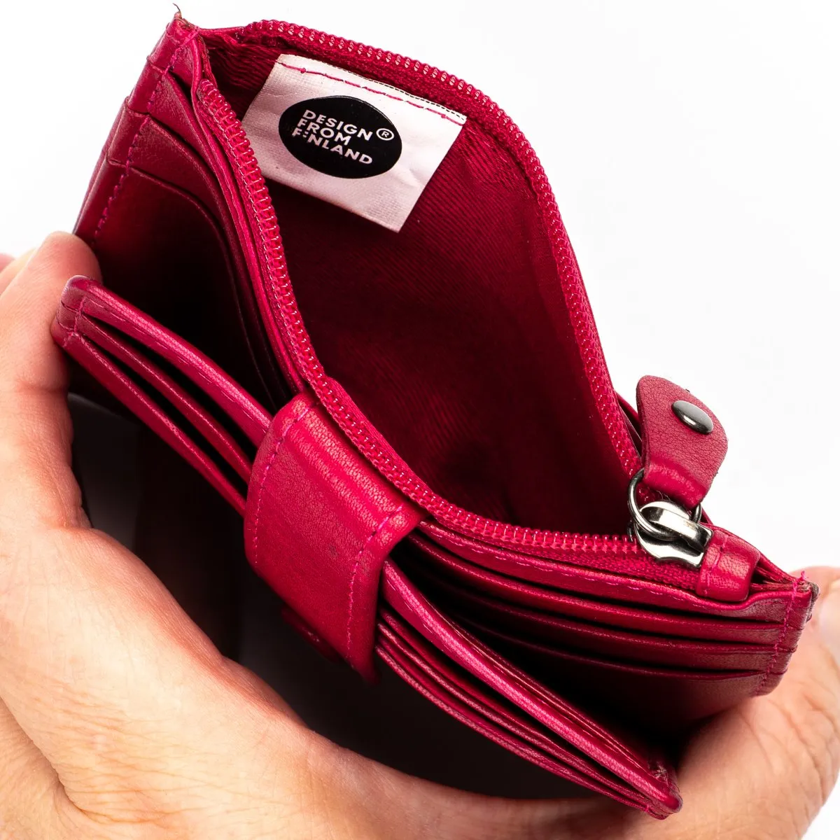 • RFID: Tuotteessa on nahkapinnan alla RFID suojaus eli radiotaajuisen etäluennan esto, jolloin lähimaksun ja henkilötietojen varastaminen pankki- tai luottokortin sirusta ei onnistu korttien ollessa tuotteen sisällä. RFID suoja ei tuotteessa näy tai tunnu siitä kertovaa pientä painettua merkkiä lukuun ottamatta.