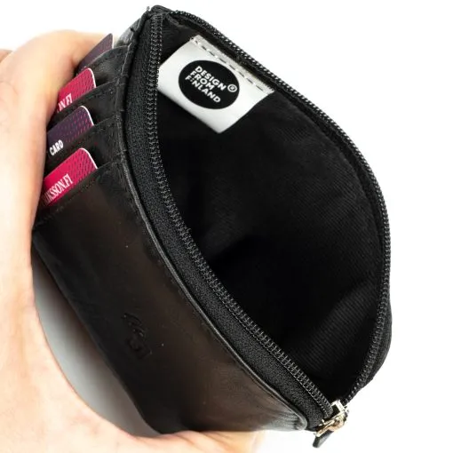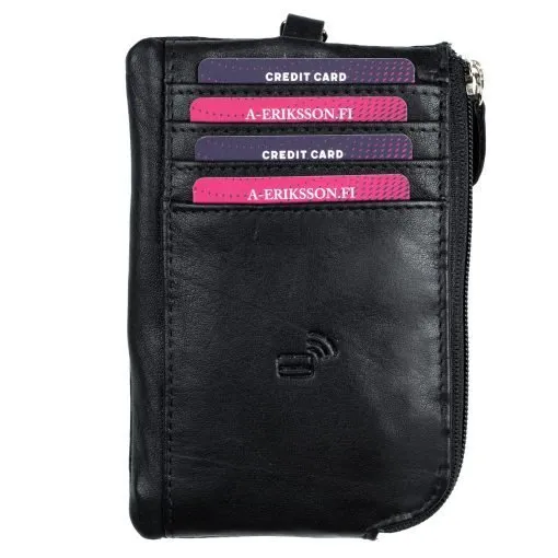 Monipuolinen pieni kukkaro jonka edessä on neljä korttitaskua ja takana vielä yksi korttitasku. Vetoketjulliseen päätaskuunmahtuu tarpeen mukaan lisää kortteja tai kolikoita ja seteleitä taitettuna ym. pientä. Kukkarossa on kiinni näyttävä metalliketju ja haka jolla sen voi ripustaa vaikka laukun sisälle kiinni tai vaihtoehtoisesti kiinnittää tuotteeseen vaikka avaimet. Tuote on RFID-suojattu, joten se estää luvattoman etäluvun lähimaksukorteista.