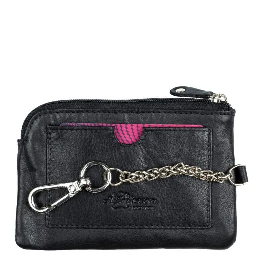 Monipuolinen pieni kukkaro jonka edessä on neljä korttitaskua ja takana vielä yksi korttitasku. Vetoketjulliseen päätaskuun mahtuu tarpeen mukaan lisää kortteja tai kolikoita ja seteleitä taitettuna ym. pientä. Kukkarossa on kiinni näyttävä metalliketju ja haka jolla sen voi ripustaa vaikka laukun sisälle kiinni tai vaihtoehtoisesti kiinnittää tuotteeseen vaikka avaimet. Tuote on RFID-suojattu, joten se estää luvattoman etäluvun lähimaksukorteista.