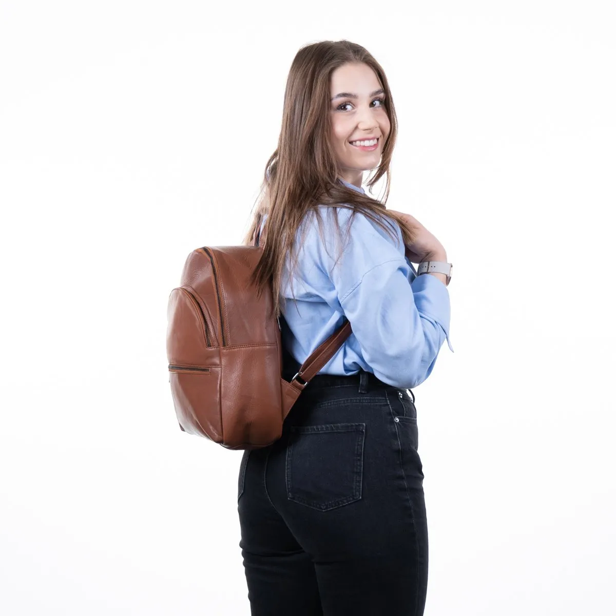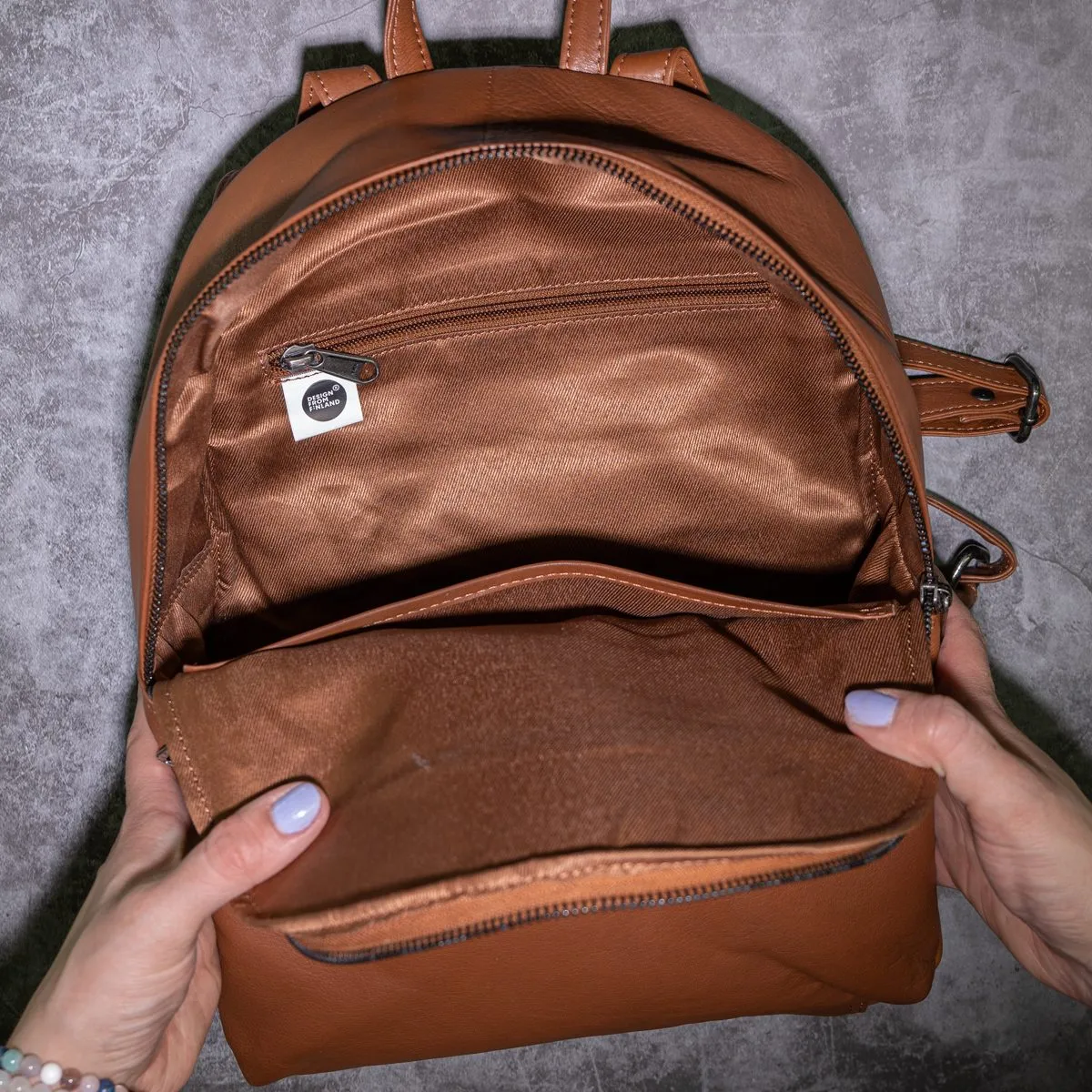 Tyylikäs nahkareppu useilla taskuilla ja hopeanvärisillä yksityiskohdilla. Repun pääosasto suljetaan vetoketjulla ja sisällä on vetoketjutasku ja avotasku vaikka puhelimelle tai minitabletille. Etupuolella kaksi vetoketjutaskua ja takana vielä vetoketjutasku sekä näppärä pieni tasku esimerkiksi matkakortille. Sirot 2 cm leveät olkahihnat joiden pituus on säädettävissä välillä 50-95 cm.