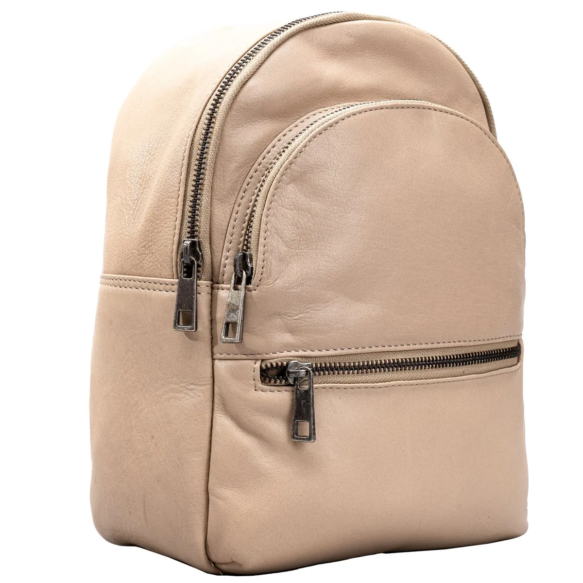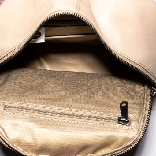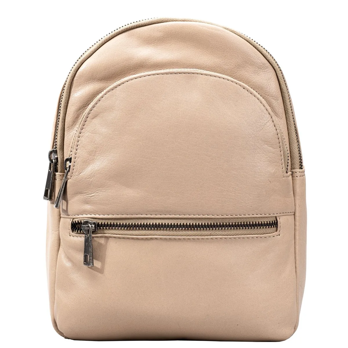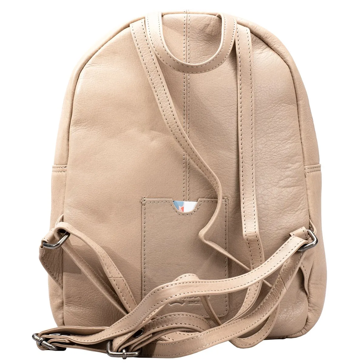Pieni ja kevyt nahkareppu useilla taskuilla. Repun pääosasto suljetaan vetoketjulla ja sisällä on kaksi vetoketjutaskua joiden lisäksi vielä avotasku vaikka puhelimelle tai minitabletille (15 x 13 cm). Etupuolella kaksi vetoketjutaskua ja takana näppärä pieni tasku esimerkiksi matkakortille. Sirot 1 cm leveät olkahihnat joiden pituus on säädettävissä välillä 50-95 cm.