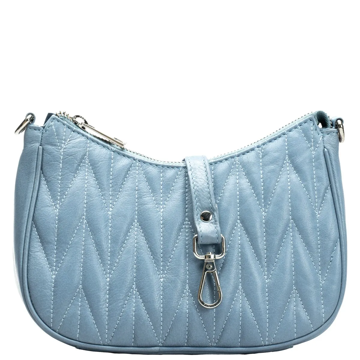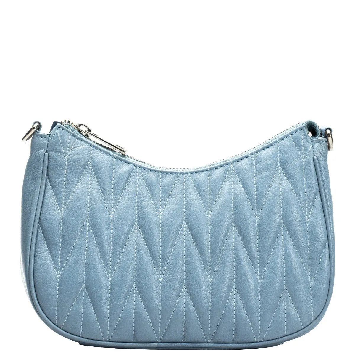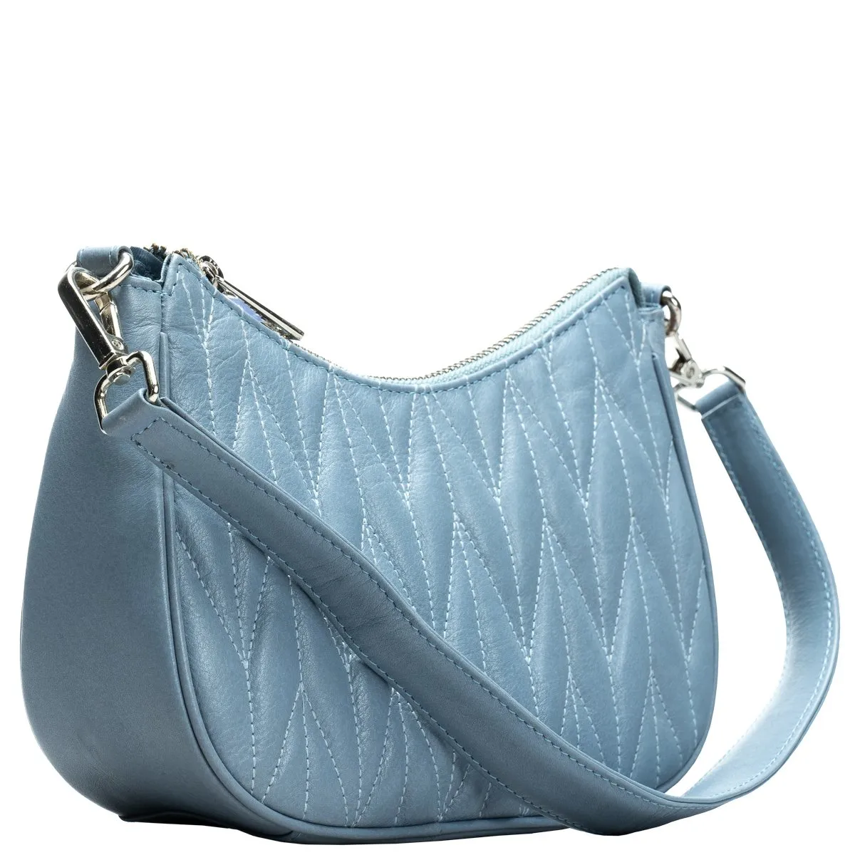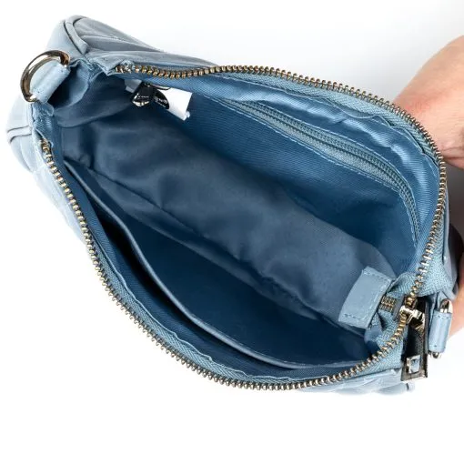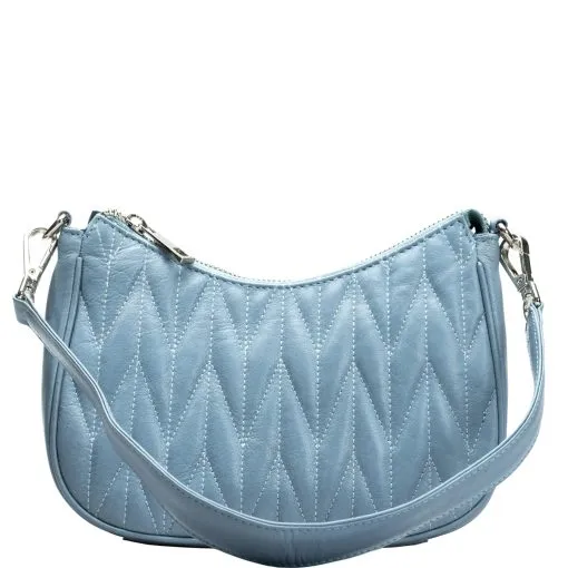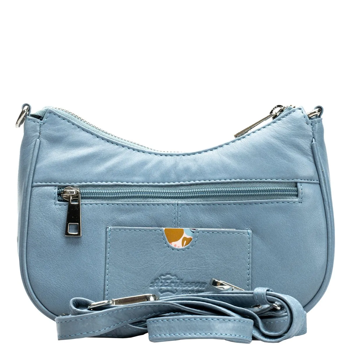 Tyylikäs laukku ihanan pehmeää kauniisti tikattua nahkaa. Päätaskussa sisällä vetoketjutasku ja avoin tasku puhelimelle tai muulle. Takapuolella vetoketjutasku ja korttipaikka esimerkiksi matkakortille. Kaksi vaihtoehtoista eripituista olkahihnaa, toinen olalle yltävä (45 cm) ja toinen pitkä säädettävä 75-140 cm. Mitat 22 cm x 13 cm (matalin kohta) x 7,5 cm.
