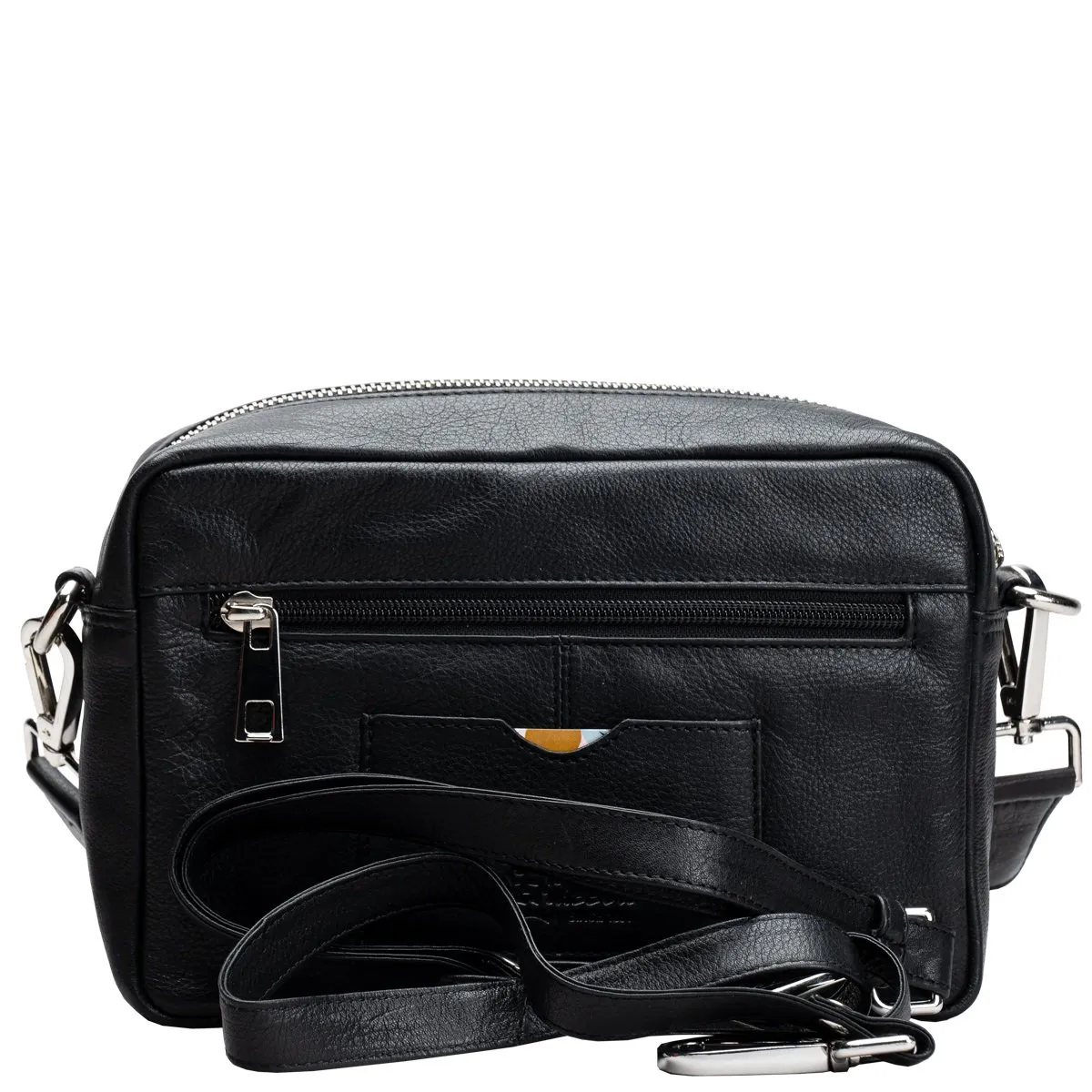Tyylikäs laukku ihanan pehmeää nahkaa. Hopeanväriset yksityiskohdat ja vetoketjulliset taskut. Päätaskussa sisällä vetoketjutasku ja avoin puhelintasku ja takapuolella vetoketjutasku sekä korttitasku esimerkiksi matkakortille. Kaksi vaihtoehtoista irrotettavaa olkahihnaa, siro nahkainen säädettävä 75-140 cm ja leveä värikäs tekstiilihihna 95 -150 cm. Laukun mitat 22 x 14 x 8 cm.