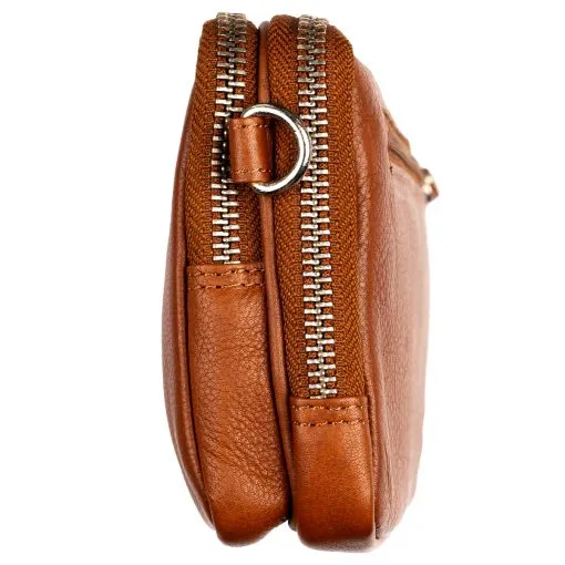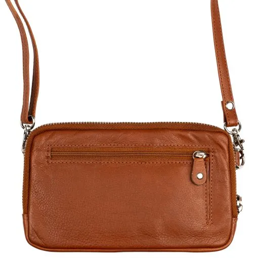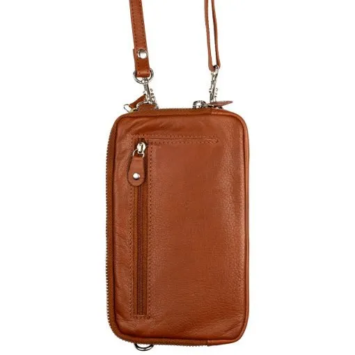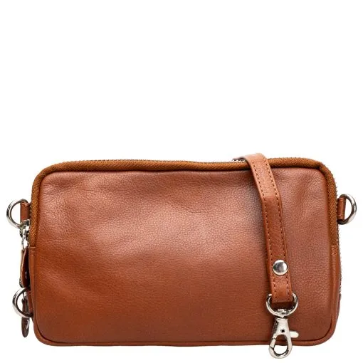 Pieni kätevä nahkainen olkalaukku jonka olkahihna on siirrettävissä siten että laukkua voi kantaa joko pysty- tai vaakasuunnassa. Laukun etummaiseen vetoketjulla suljettavaan taskuun sopii hyvin älypuhelin ulkomitoiltaan enintään 10,5 x 17 x 2 cm. Toisessa vetoketjulla suljettavassa taskussa on maksukorttien ja passin etäluennan estävä RFID-suojaus. Taskun sisällä on molemmin puolin kolme korttipaikkaa, niiden takana litteä välikkö seteleille ja taskussa tilaa esim. passille. Laukun takana on litteä vetoketjutasku kolikoille. Irrotettavan olkahihnan pituus on säädettävissä 75 cm – 140 cm. Mitat 11,5 x 18,5 x 5 cm.