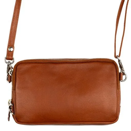 Pieni kätevä nahkainen olkalaukku jonka olkahihna on siirrettävissä siten että laukkua voi kantaa joko pysty- tai vaakasuunnassa. Laukun etummaiseen vetoketjulla suljettavaan taskuun sopii hyvin älypuhelin ulkomitoiltaan enintään 10,5 x 17 x 2 cm. Toisessa vetoketjulla suljettavassa taskussa on maksukorttien ja passin etäluennan estävä RFID-suojaus. Taskun sisällä on molemmin puolin kolme korttipaikkaa, niiden takana litteä välikkö seteleille ja taskussa tilaa esim. passille. Laukun takana on litteä vetoketjutasku kolikoille. Irrotettavan olkahihnan pituus on säädettävissä 75 cm – 140 cm. Mitat 11,5 x 18,5 x 5 cm.