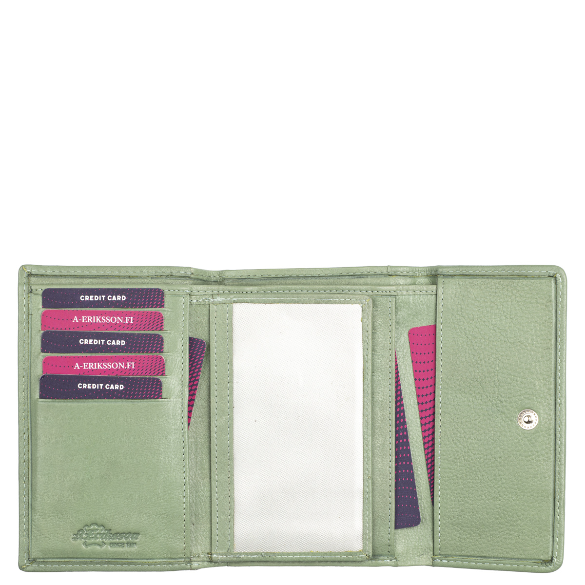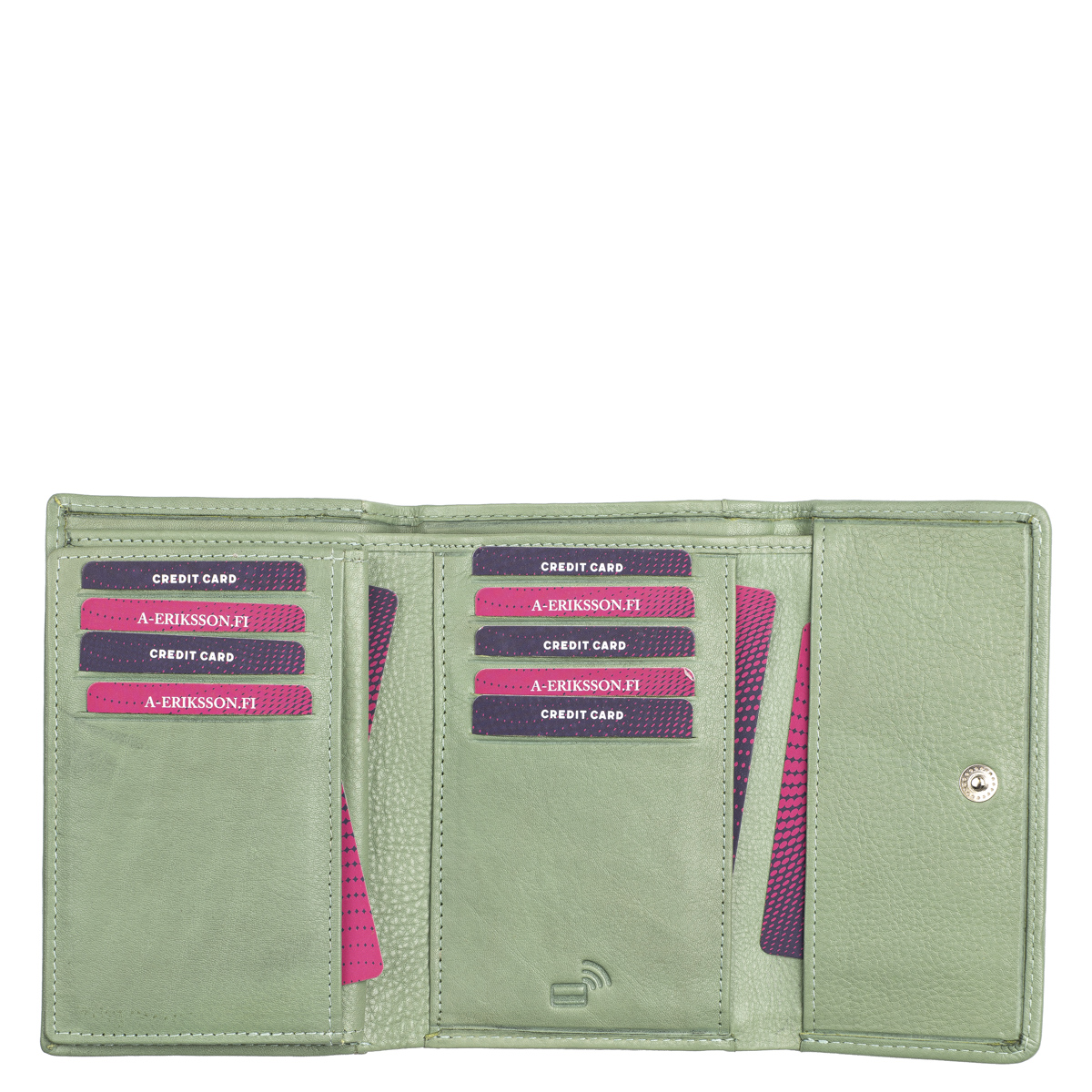 Tyylikäs nahkalompakko nepparisuljennalla. 15 korttipaikkaa joista yksi iso ikkunallinen vaikka ajokortille. Viisi muuta väliä, taustalla seteliväli ja takapuolella vetoketjullinen kaksiosainen kolikkotasku. RFID-suojaus estää lähimaksukorttien luvattoman etäluvun.