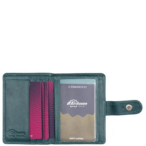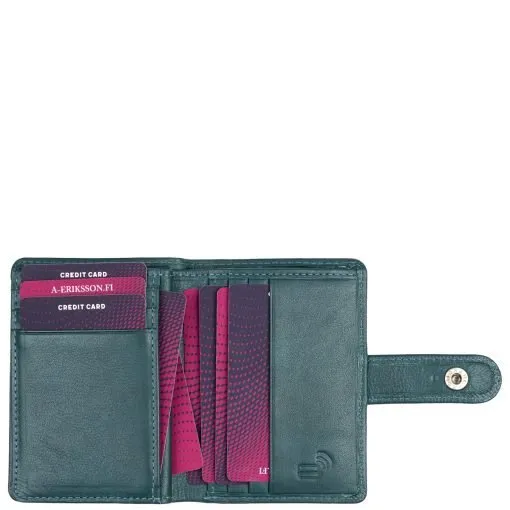 Söpö Himmi-pikkulompakko aitoa nahkaa. Tuplaneppari helpottaa täyden lompakon sulkemista ja pitää kortit turvallisesti paikoillaan. Kuusi keskellepäin aukeavaa korttipaikkaa sekä neljä muuta taskua. Ikkunallinen paikka esimerkiksi henkilökortille ja vielä kolme ylöspäin aukeavaa korttipaikkaa Taustalla seteliväli ja takapuolella vetoketjullinen pieni kolikkotasku. RFID-suojaus estää lähimaksukorttien luvattoman etäluvun. Mitat: 8 x 11 x 2 cm.