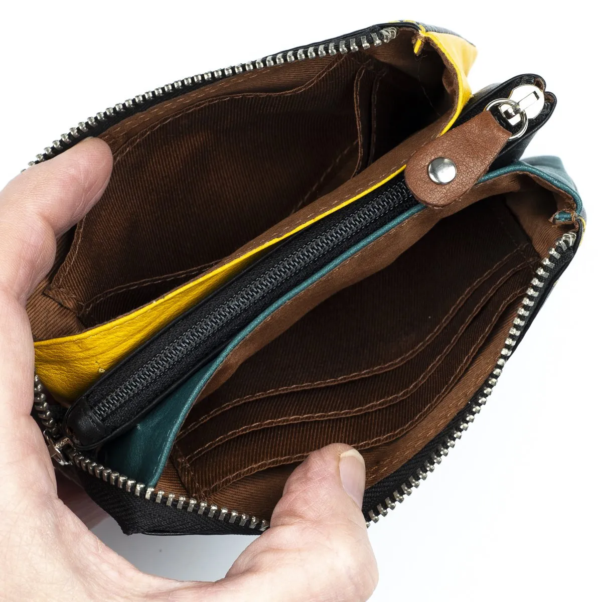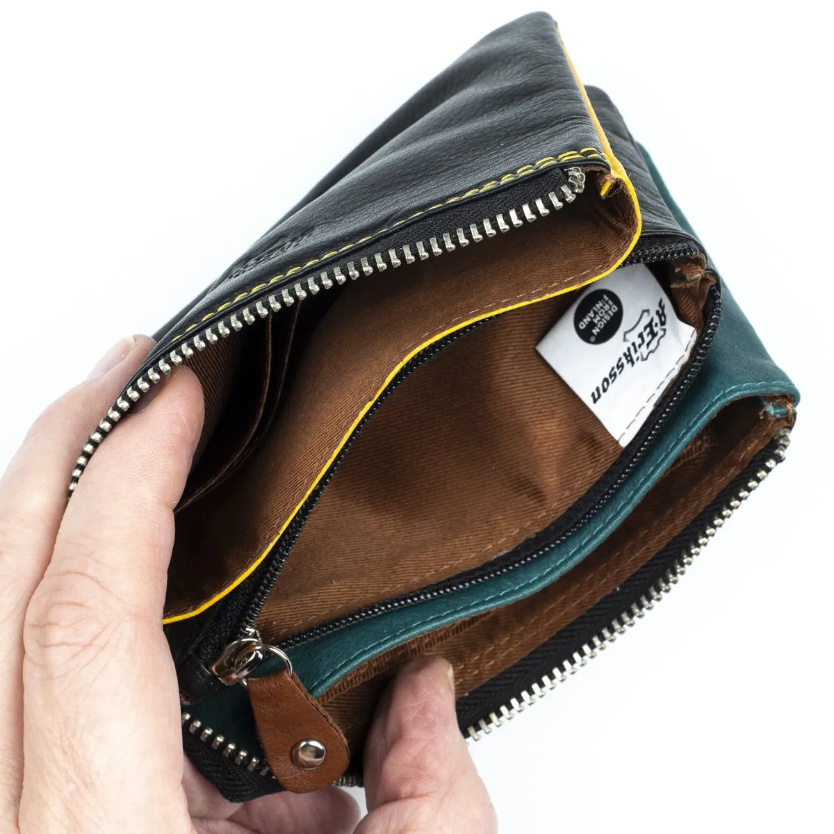 A. Eriksson Högsar-malliston tyylikäs nahkainen Hope-korttikukkaro RFID-suojauksella. Vetoketjun alla kolme lokeroa, joista keskimmäinen omalla vetoketjulla suljettava, esimerkiksi kolikoille tai avaimelle, ja sivuissa olevissa lokeroisa korttipaikkoja maksukorteille. Lisäksi kaksi kapeaa taskua joihin mahtuu kortti tai taitettu seteli. Korttipaikat: 6+2, lisää mahtuu tarvittaessa lokeroon. RFID: Korttilkukkaron ulkosivuissa on etäluvun estävä suojakalvo.
