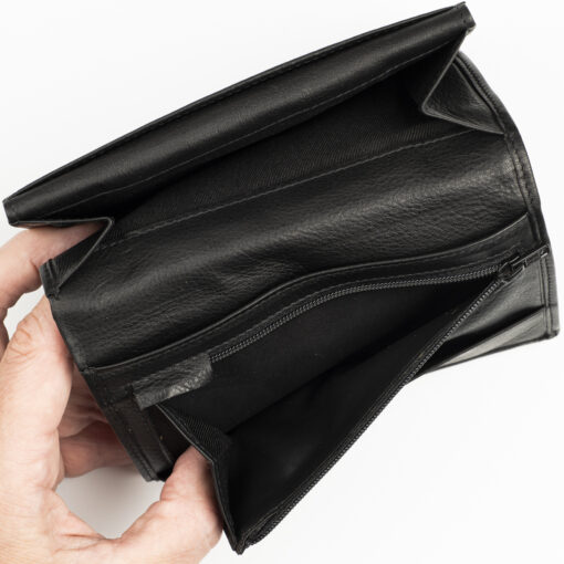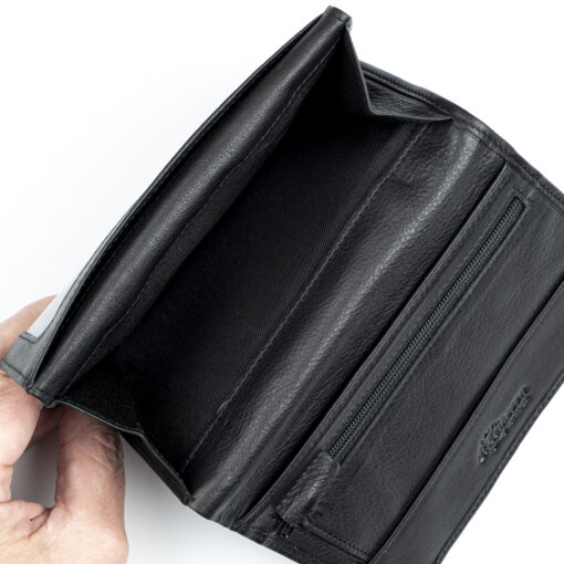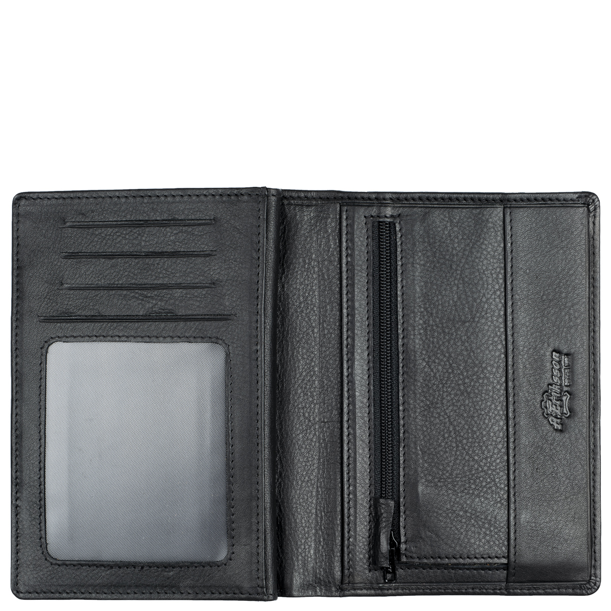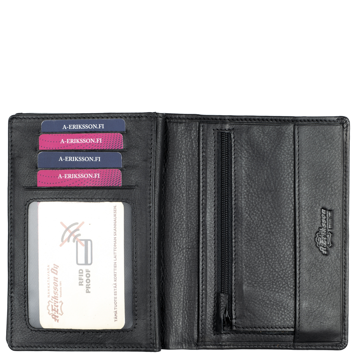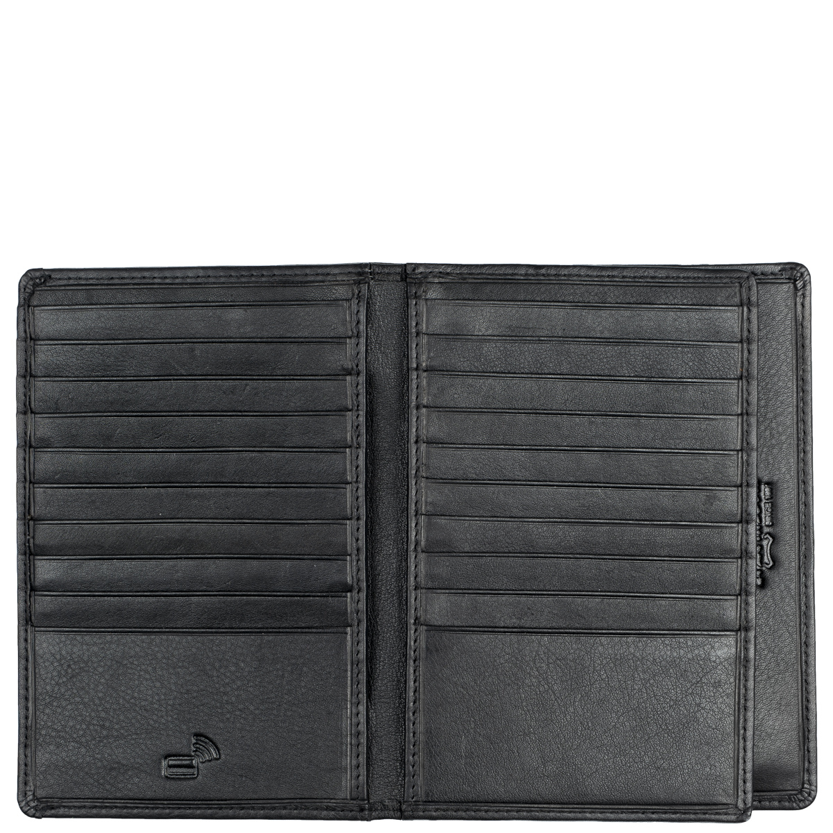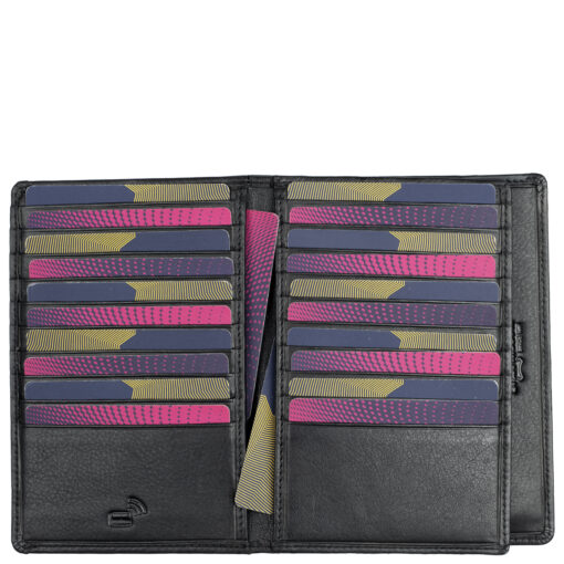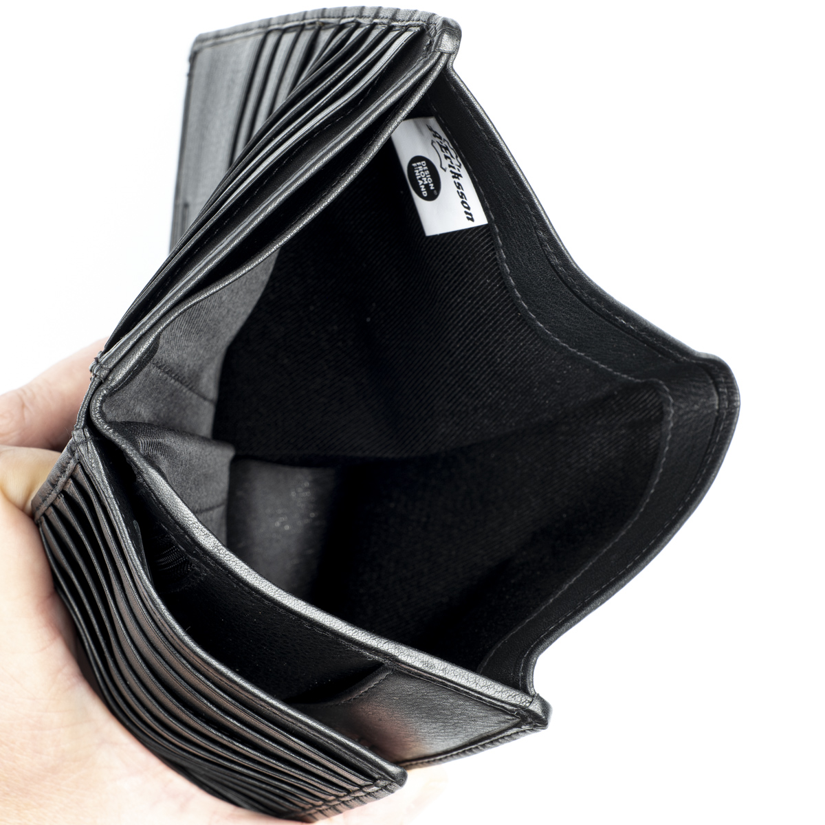 Tilava nahkalompakko useilla korttipaikoilla. Jopa 24 korttipaikkaa, joista yksi on ikkunallinen. Lisäksi useita muita välejä, seteleille syvä tasku ja kolikoille vetoketjutasku.