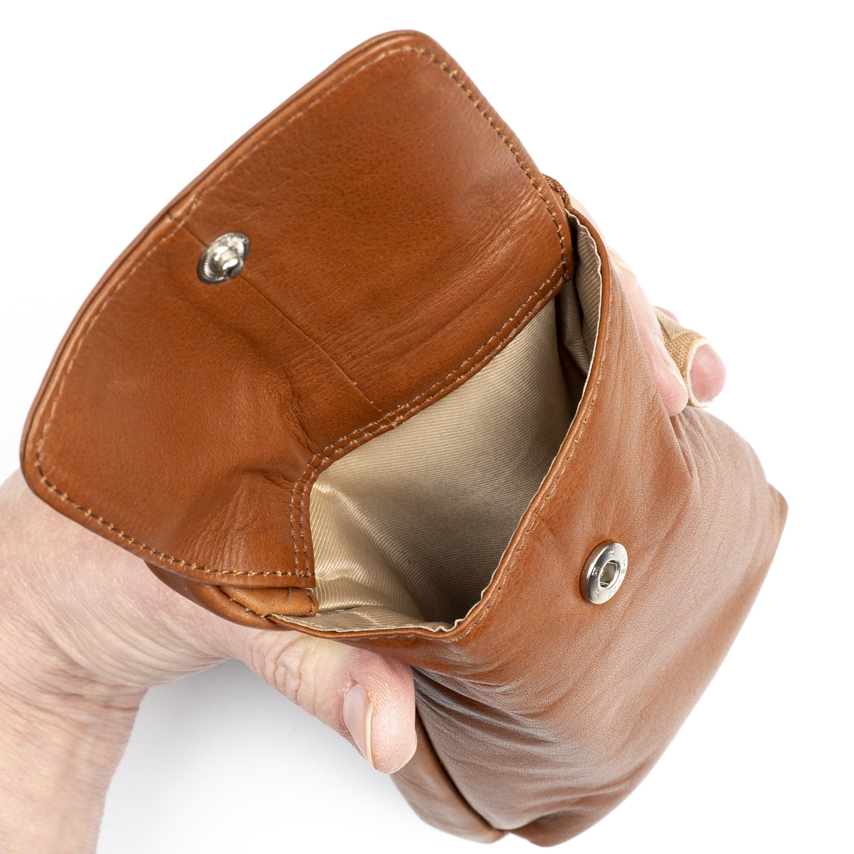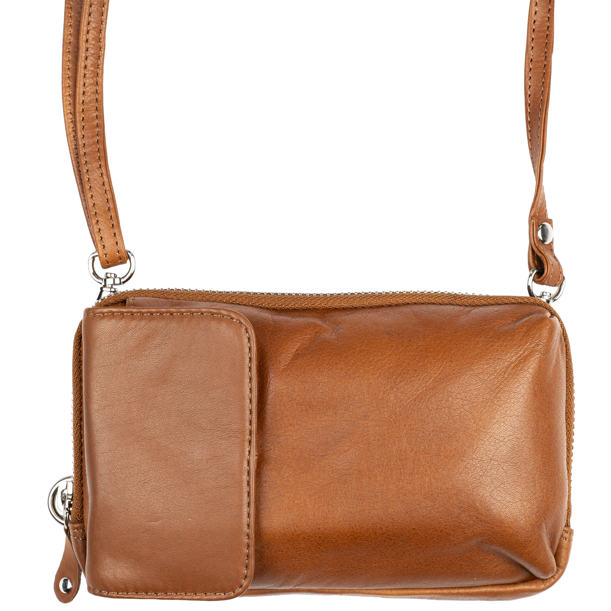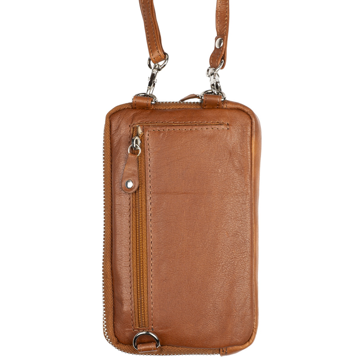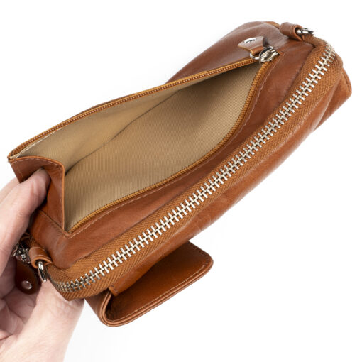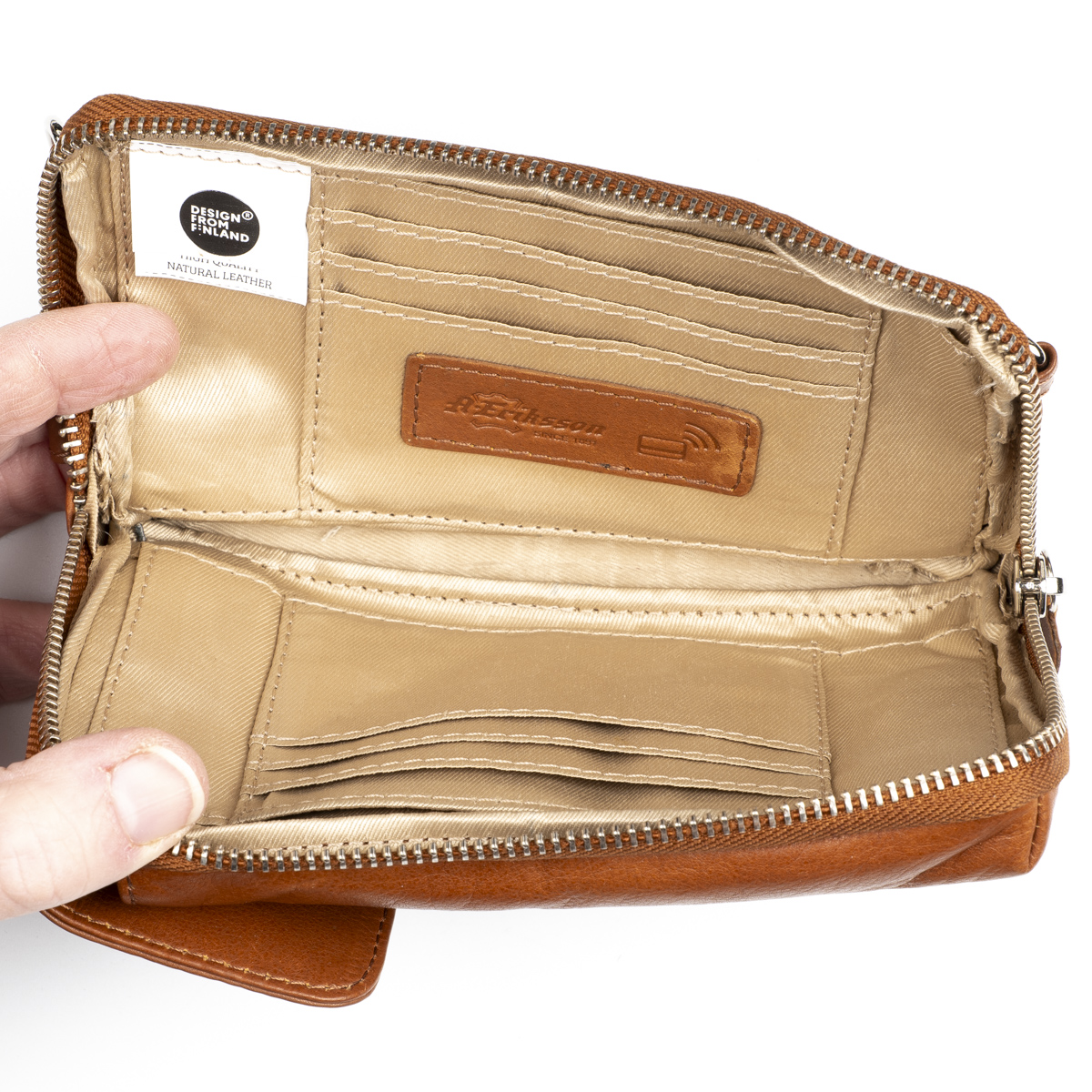 Vetoketjulla suljettava osio, jossa RFID-suoja estää maksukorttien luvattoman etäluvun. Taskun sisällä molemmin puolin kolme korttipaikkaa ja niiden takana pidemmät väliköt esim. seteleille. Laukussa on tilaa myös esimerkiksi passille. Laukun etupuolella nepparilla suljettavaan taskuun mahtuu puhelin ulkomitoiltaan noin max. 8,5 x 16,5 cm. Laukun takapuolella on litteä vetoketjutasku esim. kolikoille.