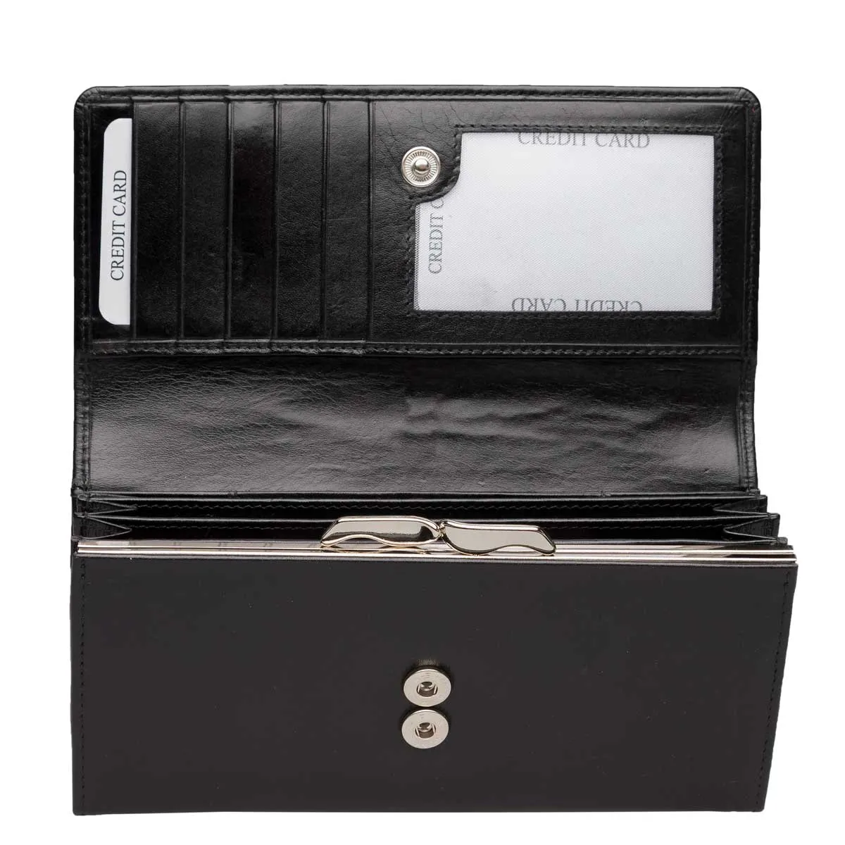 Nahkalompakko, jossa 12 paikkaa korteille, kehystasku (klipsu) kolikoille, vetoketjullinen tasku sekä useita lokeroita. Kansi suljetaan nepparilla, kiinnityskohtia on kaksi jolloin täydenkin lompakon saa suljettua. Mitat 18 x 9 x 3,5 cm.