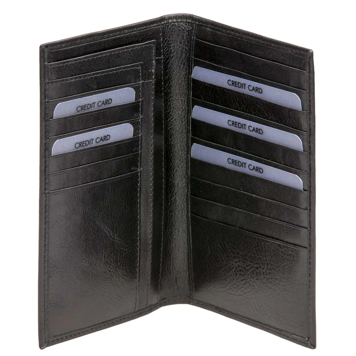 Erittäin laadukasta naudan nahkaa. Pystymallinen, tilava nahkalompakko setelelehdillä. 16 korttipaikkaa, seteleille kaksi pystylehteä ja kaksi muuta väliä. Ei kolikkotaskua. Mitat 10 x 16,5 cm
