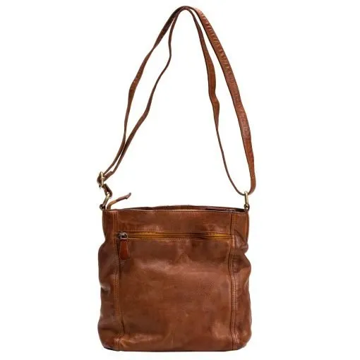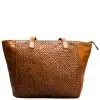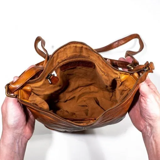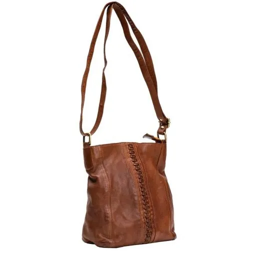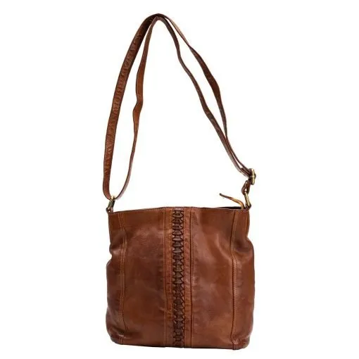 Patinoitunut nahkalaukku upealla ja taidokkaalla käsinpunotulla somisteella. Nahan näyttävä pinta on saatu aikaan pesemällä tuote valmistusvaihessa suuressa rummussa. Laukku suljetaan vetoketjulla ja sisältä löytyy pussi esim. puhelimelle, pari kynäpidikettä sekä vetoketjullinen tasku. Laukun takana on vetoketjullinen tasku. Olkahihna on portaattomasti säädettävissä 65-120cm. Mitat 22x25x9cm.