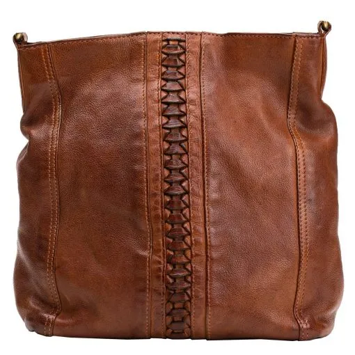 Patinoitunut nahkalaukku upealla ja taidokkaalla käsinpunotulla somisteella. Nahan näyttävä pinta on saatu aikaan pesemällä tuote valmistusvaihessa suuressa rummussa. Laukku suljetaan vetoketjulla ja sisältä löytyy pussi esim. puhelimelle, pari kynäpidikettä sekä vetoketjullinen tasku. Laukun takana on vetoketjullinen tasku. Olkahihna on portaattomasti säädettävissä 65-120cm. Mitat 22x25x9cm.