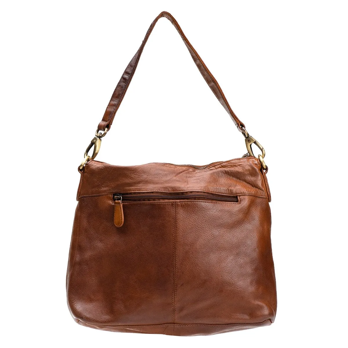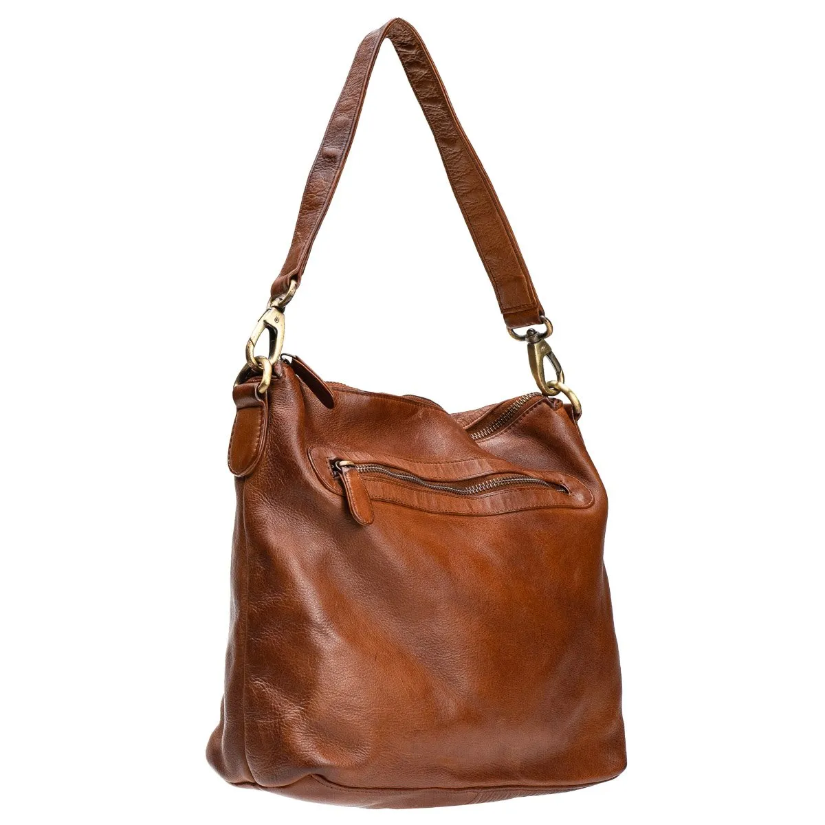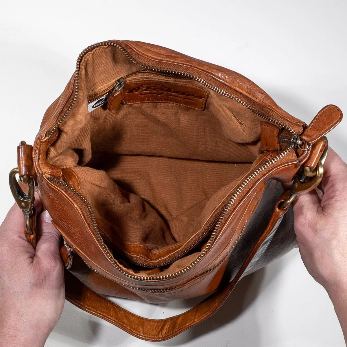 Patinoitunut nahkalaukku jonka näyttävä pinta on saatu aikaan pesemällä tuote valmistusvaihessa suuressa rummussa. Laukku suljetaan vetoketjulla ja sen sisällä on vetoketjullinen väliseinä. Ensimmäisessä osastossa on pussi esim. puhelimelle, pari kynäpidikettä ja toisessa vetoketjullinen tasku. Laukun molemmin puolin vetoketjulliset tasku. Olkahihna on portaattomasti säädettävissä 65-120cm, lisäksi mukana on toinen lyhyt hihna, molemmat hihnat ovat irrotettavissa. Mitat 30x24x9cm.Paino 800 g.