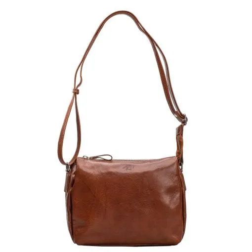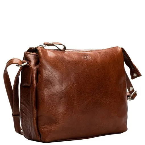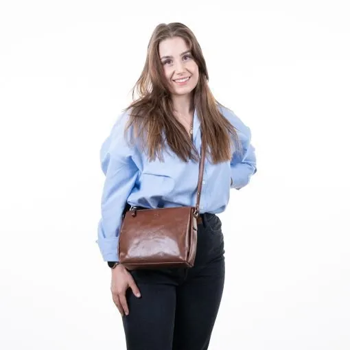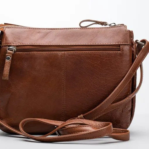 Monipuolinen “lokero unelma”, nahkalaukku säädettävällä olkahihnalla. Laukku suljetaan vetoketjulla. Sisällä on kolme isoa osastoa joiden väleissä vetoketjulliset taskut. Laukun sisällä lisäksi puhelintasku sekä kolmaskin vetoketjutasku. Laukun takana on myös vetoketjullinen tasku. Portaattomasti säädettävän olkahihnan pituus 70-130 cm. Mitat: 24 x 19 x 7-8 cm. Paino 380 g.