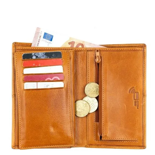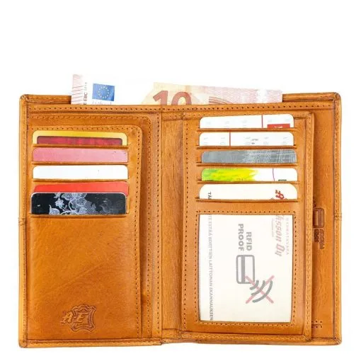 Upea nahkalompakko. 15 korttipaikkaa, joista yhdessä läpinäkyvä ikkuna. Vetoketjullinen kolikkotasku. Setelit saa lompakon sivuun kahteen eri lokeroon tai taustalle syvään lokeroon. RFID – suojaus. Päällä poikittain koristetikkaus. Mitat: 9×14,5×2,5cm.