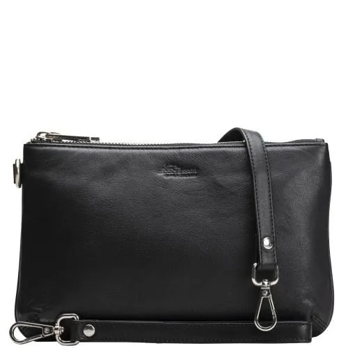 Odette on tyylikäs laukku ihanan pehmeää nahkaa. Arkeen ja juhlaan sopivassa laukussa on kaksi isoa vetoketjutaskua sekä niiden väliin jäävä magneettikiinnitteinen tasku. Toisessa vetoketjutaskussa on sisävetoketjutasku ja korttipaikat ja toisessa avoin tasku esimerkiksi puhelimelle. Laukun takapuolella yksi korttipaikka vaikka matkakortille. Irrotettava ja säädettävä pitkä olkahihna sekä rannelenkki.