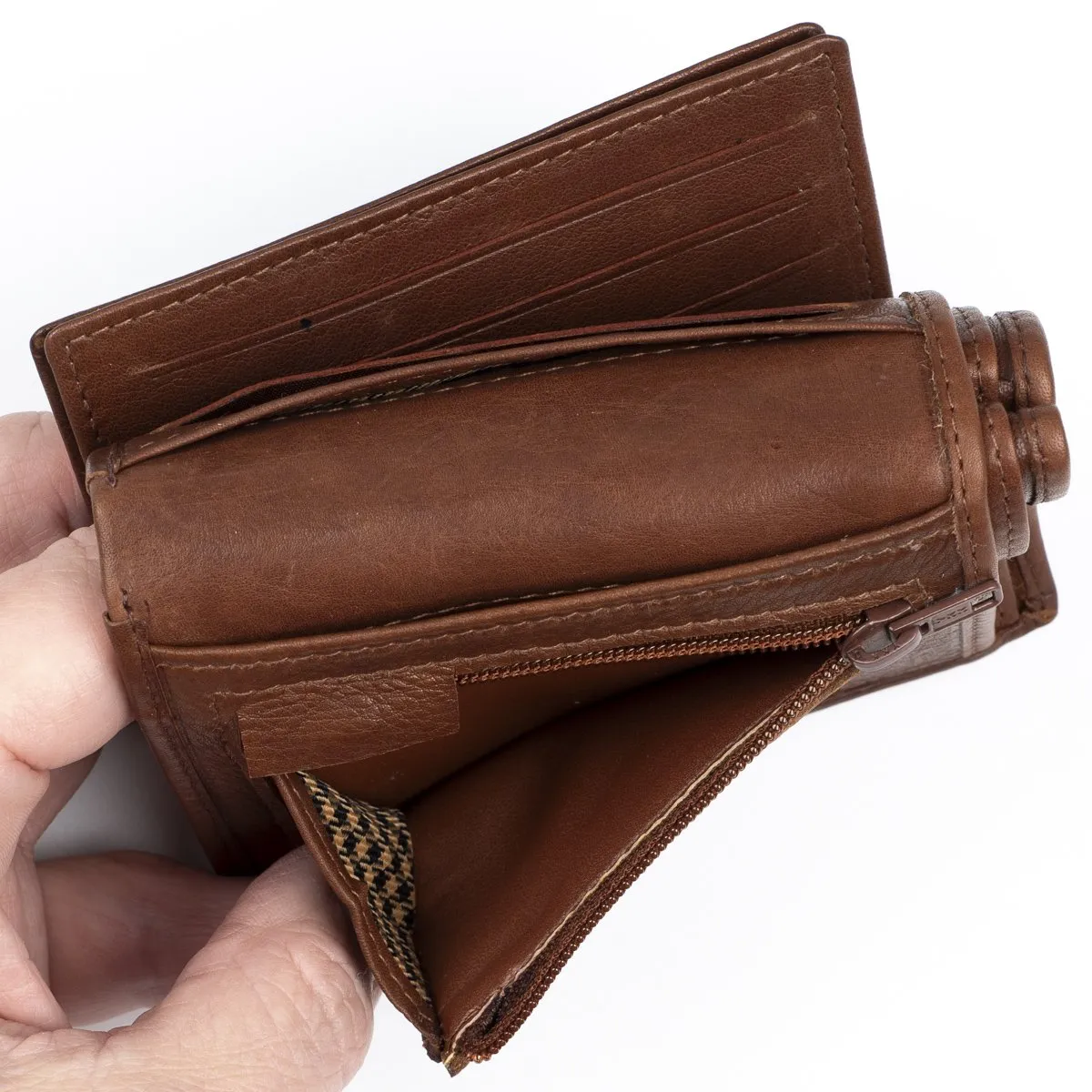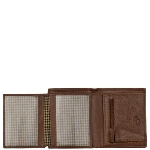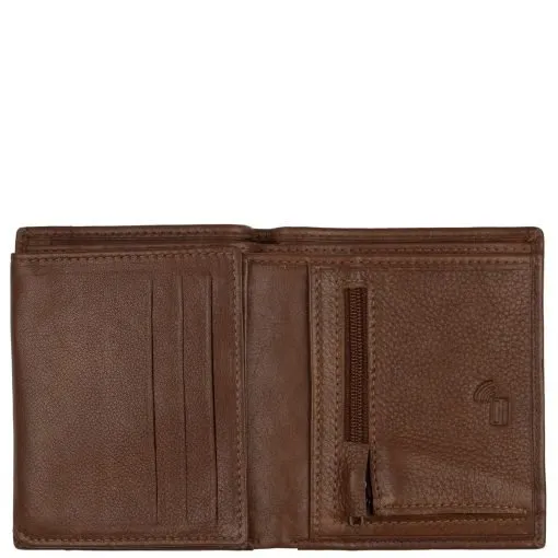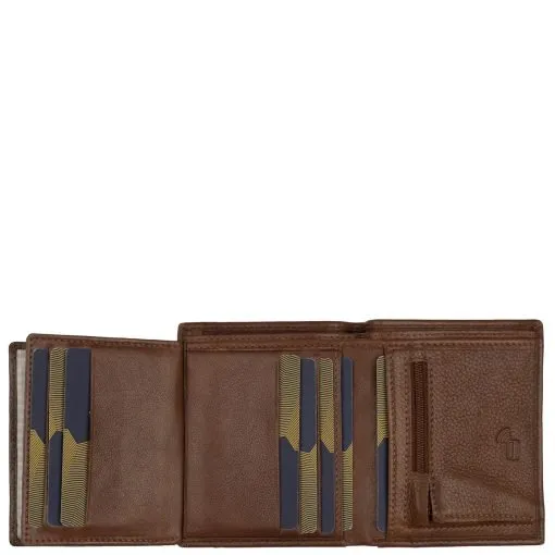 Monipuolinen nahkalompakko kauniilla leikkauksella tuotteen kannessa. Nahka on erittäin tukevaa, mutta silti pehmeää naudan nahkaa. Lompakossa on kaksi erillistä vasemmalle taittuvaa läppää joissa molemissa läpinäkyvä tasku ja toisella puolella 3 korttipaikkaa, näiden alla vielä 3 paikkaa korteille lisää. Lisäksi vielä pari muuta taskua. Taustalla kaksioisanen setelivälikkö jossa piilossa läpän alla vielä 1 korttitasku, lompakossa yhteensä siis 12 korttipaikkaa. Lompakossa myös vetoketjullinen kolikkotasku. Mitat:9x11x2,5 cm.