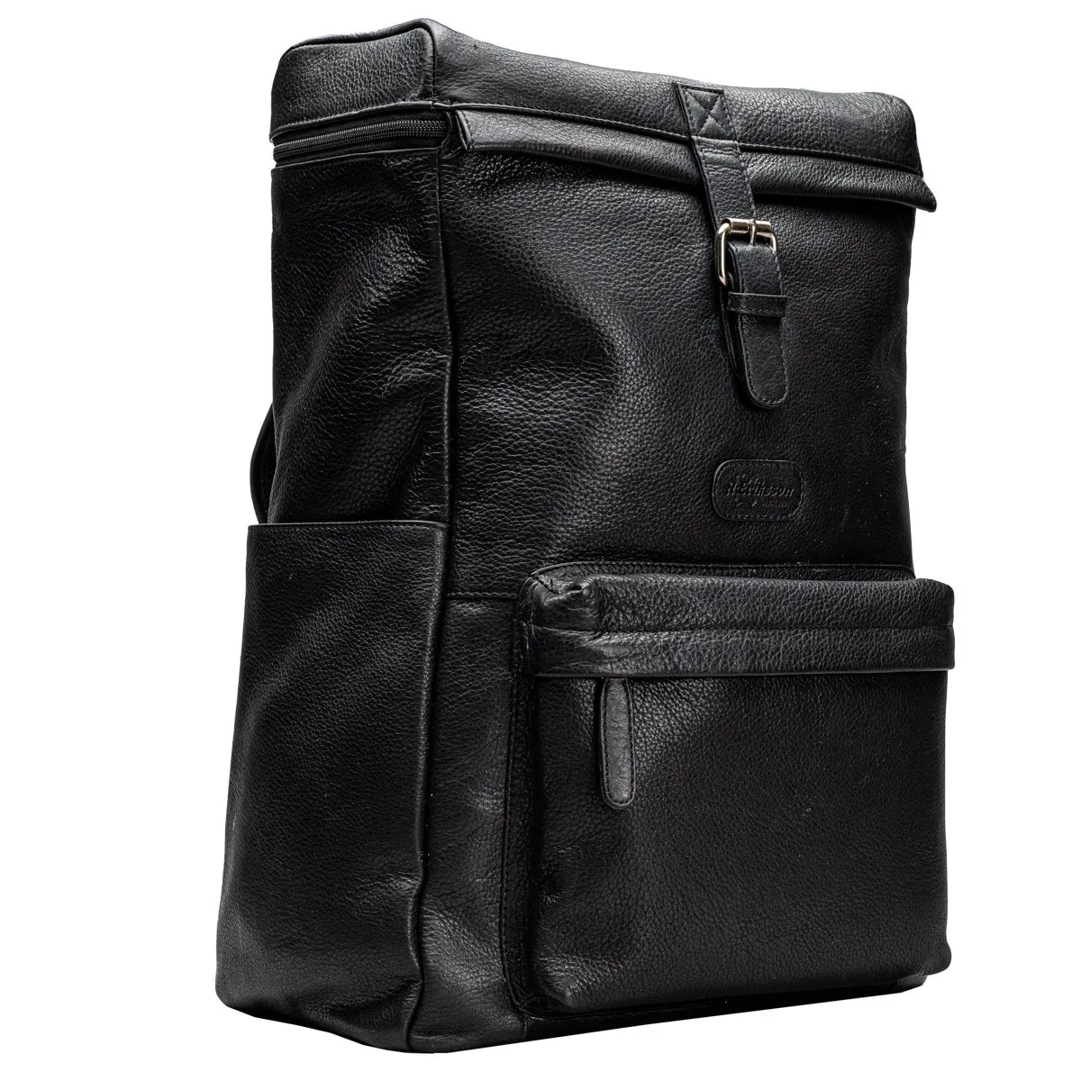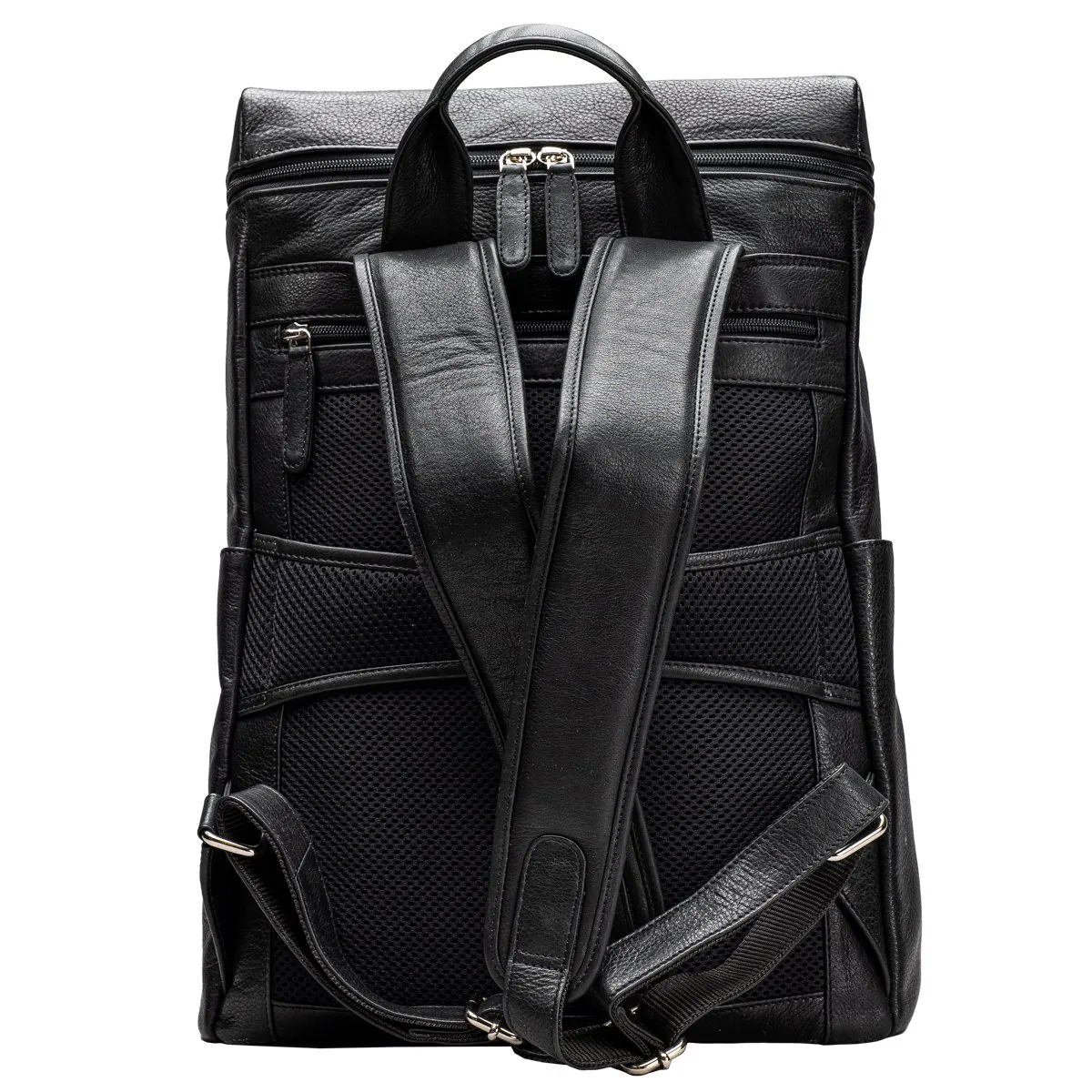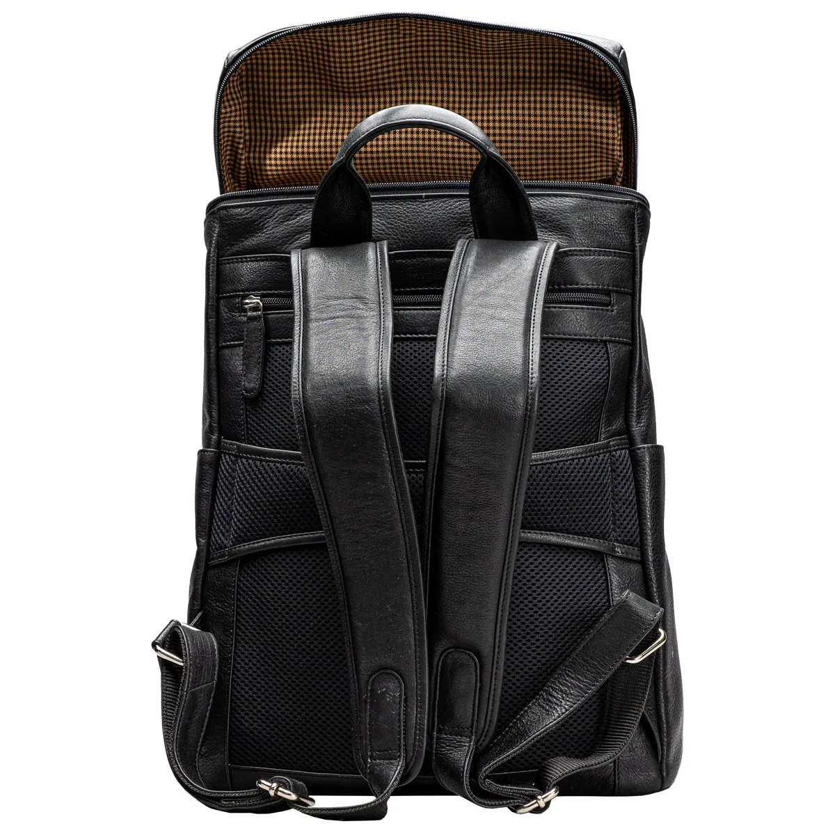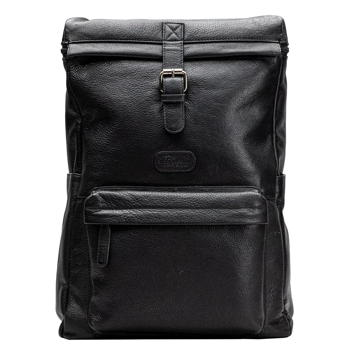 Tilava nahkareppu tyylikkäillä yksityiskohdilla. Päätaskun vetoketju aukeaa selän puolelta jolloin sitä on vaikeampi avata huomaamattomasti repun ollessa selässä. Molemmilla sivuilla taskut esimerkiksi juomapullolle, edessä ja takana selkää vasten vetoketjulliset taskut ja selkäpuolella vielä väli josta repun saa tukevasti kulkemaan matkalaukun päällä aisassa kiinni. Sisällä pehmustettu osio läppärille 25 x 34 cm. Mitat: 29 x 42 x 16 cm.
