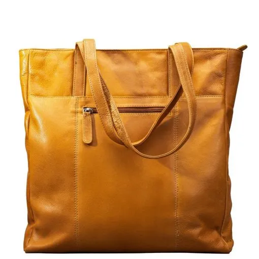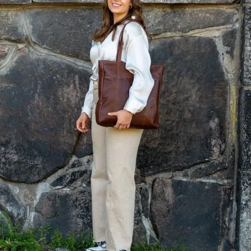 Pystymallinen shopperi pehmeästä nahasta. Laukku suljetaan päältä vetoketjulla. Sisäosa on yhtä isoa tilaa, sivussa avotasku sekä vetoketjutasku. Laukun edessä avotasku ja takana vetoketjutasku. Hihnojen leveys 2 cm, ja pituus 56 cm. Laukun mitat: 36 x 34 x 10cm. Ruudullinen vuoraus, vuorikangas polycottonia.