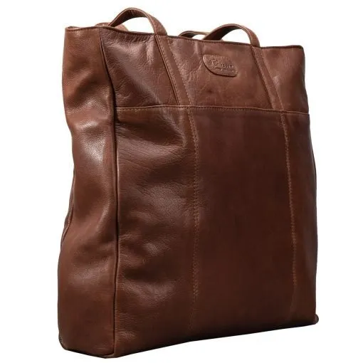 Pystymallinen shopperi pehmeästä nahasta. Laukku suljetaan päältä vetoketjulla. Sisäosa on yhtä isoa tilaa, sivussa avotasku sekä vetoketjutasku. Laukun edessä avotasku ja takana vetoketjutasku. Hihnojen leveys 2 cm, ja pituus 56 cm. Laukun mitat: 36 x 34 x 10cm. Ruudullinen vuoraus, vuorikangas polycottonia.