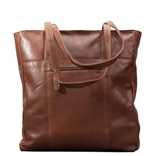 Pystymallinen shopperi pehmeästä nahasta. Laukku suljetaan päältä vetoketjulla. Sisäosa on yhtä isoa tilaa, sivussa avotasku sekä vetoketjutasku. Laukun edessä avotasku ja takana vetoketjutasku. Hihnojen leveys 2 cm, ja pituus 56 cm. Laukun mitat: 36 x 34 x 10cm. Ruudullinen vuoraus, vuorikangas polycottonia.