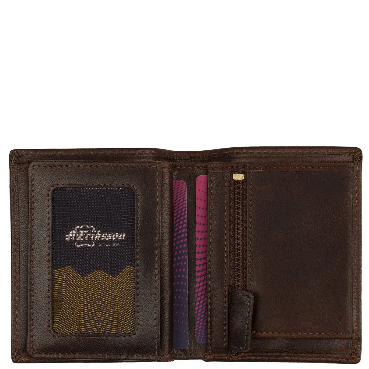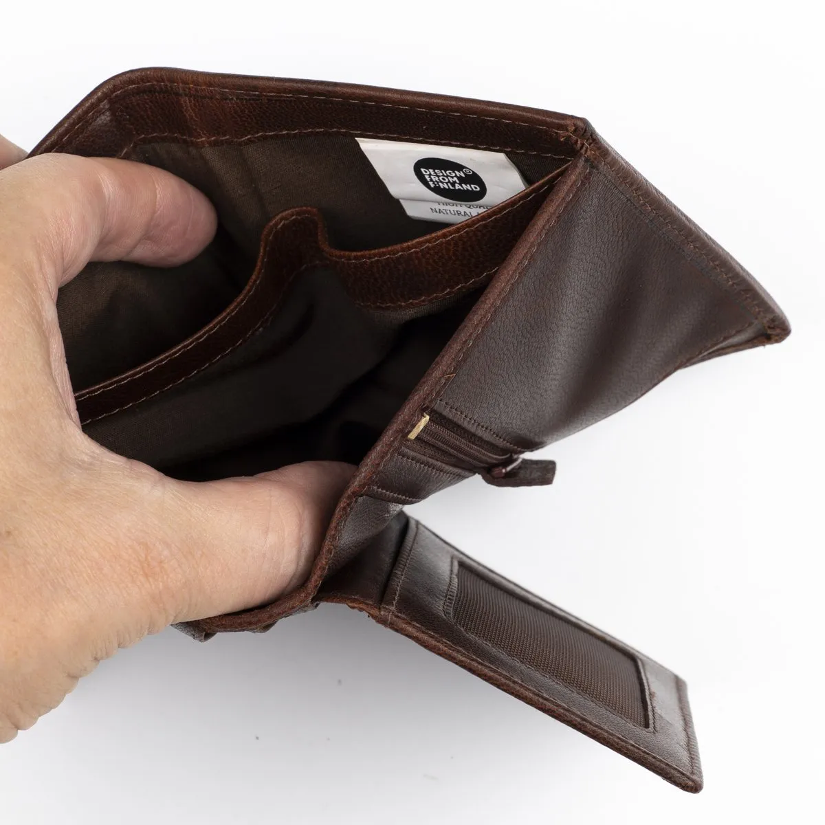 Poikko-malliston Panu on tyylikäs RFID-suojattu lompakko laadukasta nahkaa. Viisi keskellepäin aukeavaa korttipaikkaa, yksi ikkunallinen tasku ja pieni vetoketjutasku kolikoille. Pari muuta väliä korteille tai kuiteille ja taustalla kaksiosainen seteliväli.
