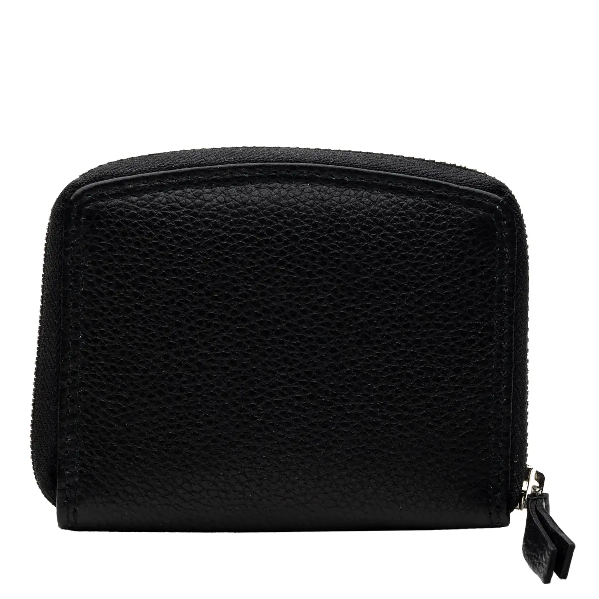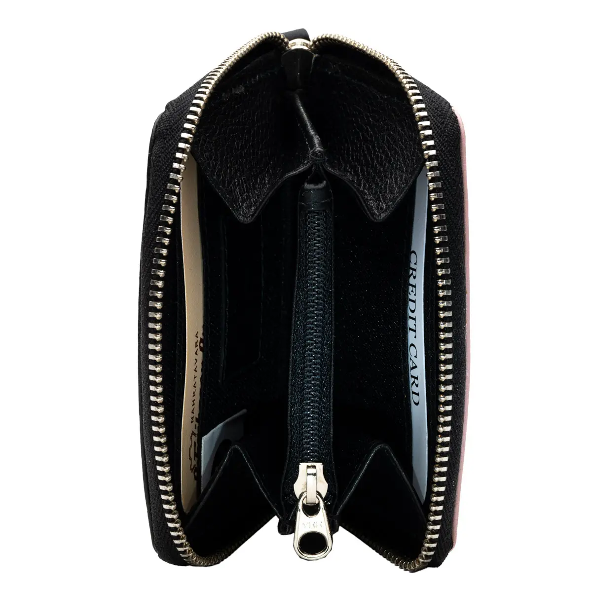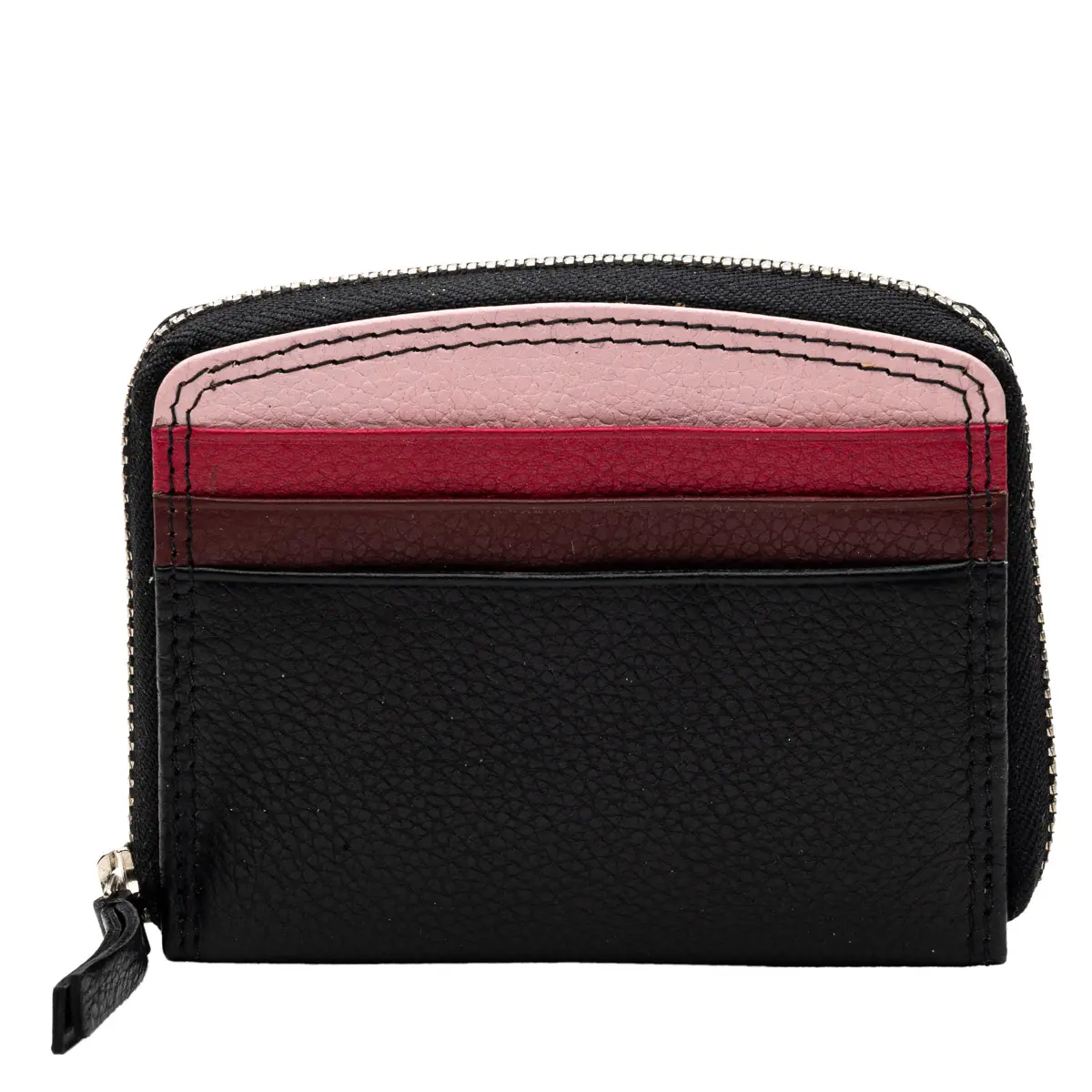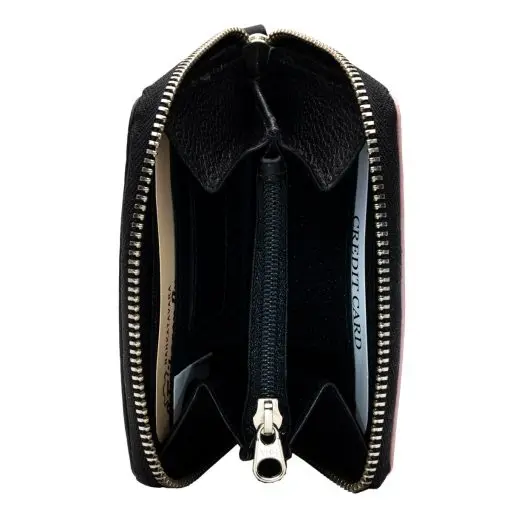 Sievä nahkainen pikkulompakko tehosteväreillä. Kaksi korrtipaikkaa etupuolella ja vetoketjulla suljettavassa sisäosassa neljä korttipaikkaa lisää sekä vetoketjullinen pikkutasku. RFID-suoja estää lähimaksukorttien etäluvun. Mitat 10 x 8 cm.