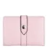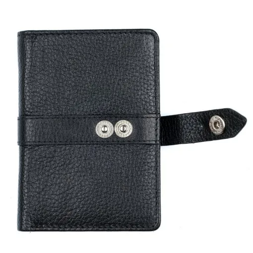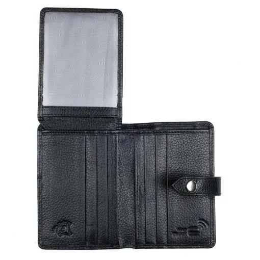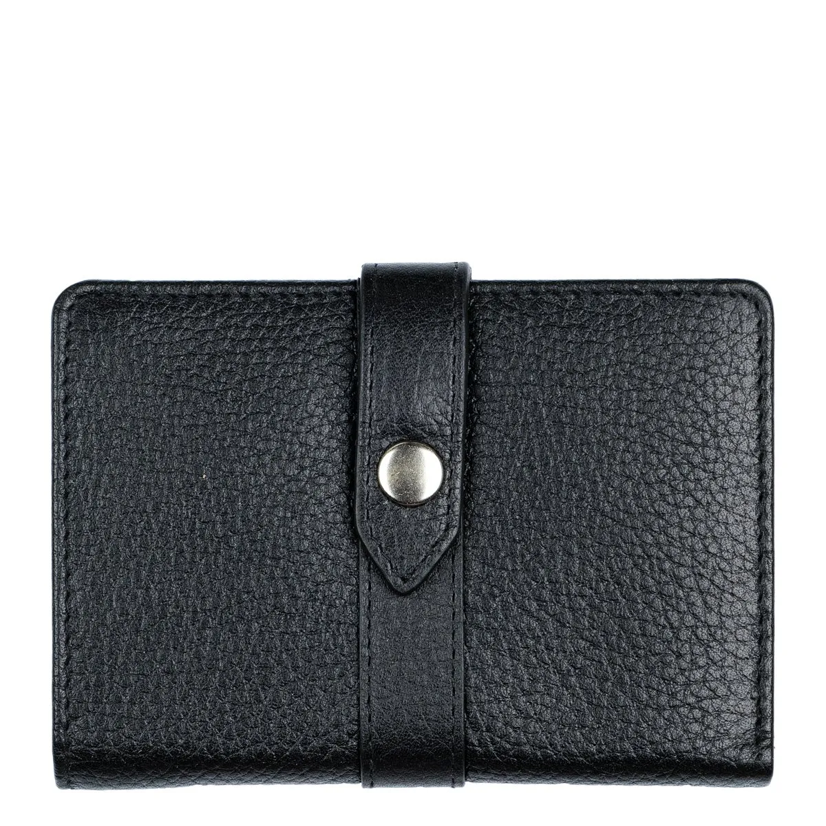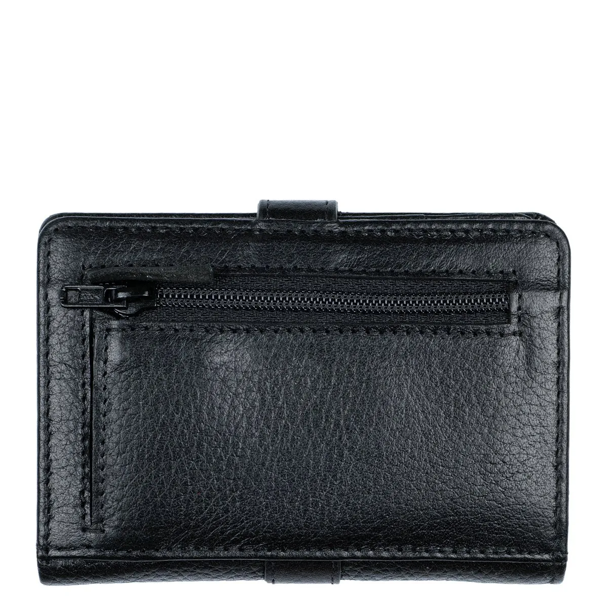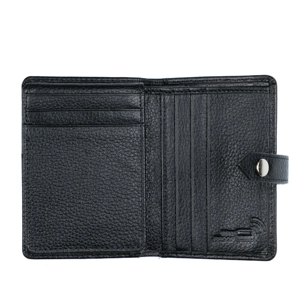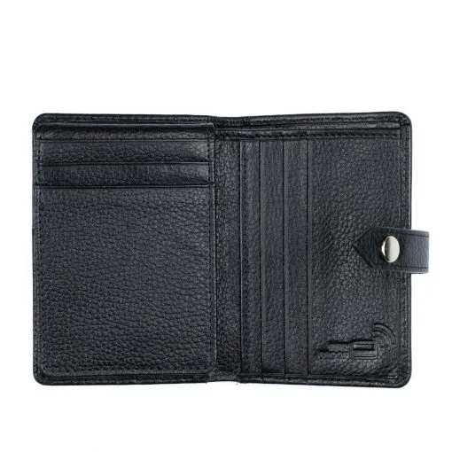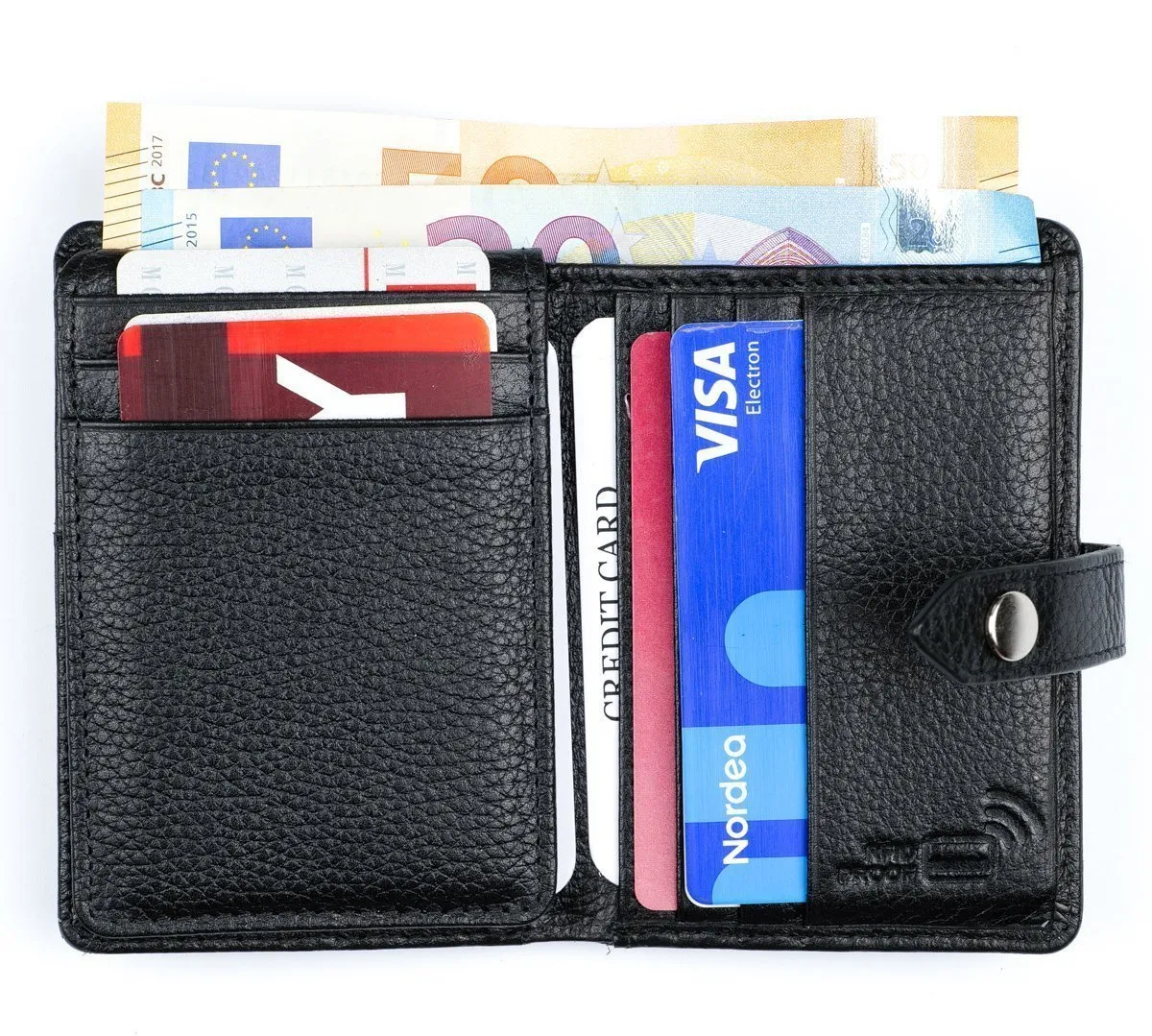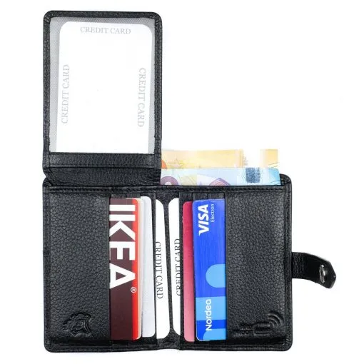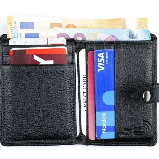 Tyylikäs pikkulompakko aitoa nahkaa. Tuplaneppari helpottaa täyden lompakon sulkemista. Ylöspäin nousevassa läpässä neljä korttipaikkaa joista yksi on ikkunallinen. Kuusi keskellepäin aukeavaa korttipaikkaa sekä pari muuta väliä. Taustalla seteliväli ja takapuolella vetoketjullinen pieni kolikkotasku. RFID-suojaus estää lähimaksukorttien luvattoman etäluvun. Mitat: 8 x 11 cm